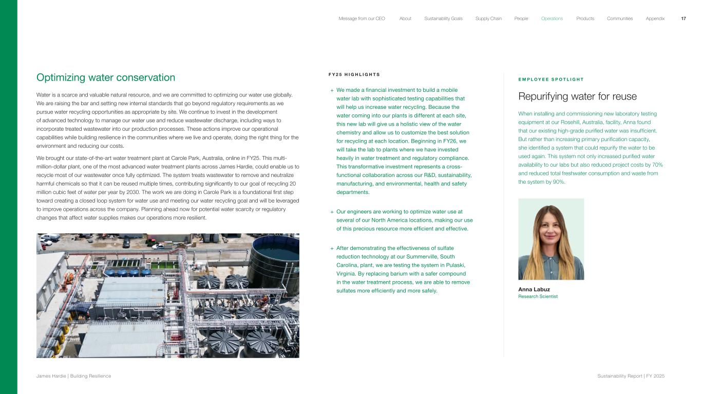 Optimizing water conservation Water is a scarce and valuable natural resource, and we are committed to optimizing our water use globally. We are raising the bar and setting new internal standards that go beyond regulatory requirements as we pursue water recycling opportunities as appropriate by site. We continue to invest in the development of advanced technology to manage our water use and reduce wastewater discharge, including ways to incorporate treated wastewater into our production processes. These actions improve our operational capabilities while building resilience in the communities where we live and operate, doing the right thing for the environment and reducing our costs. We brought our state-of-the-art water treatment plant at Carole Park, Australia, online in FY25. This multi- million-dollar plant, one of the most advanced water treatment plants across James Hardie, could enable us to recycle most of our wastewater once fully optimized. The system treats wastewater to remove and neutralize harmful chemicals so that it can be reused multiple times, contributing significantly to our goal of recycling 20 million cubic feet of water per year by 2030. The work we are doing in Carole Park is a foundational first step toward creating a closed loop system for water use and meeting our water recycling goal and will be leveraged to improve operations across the company. Planning ahead now for potential water scarcity or regulatory changes that affect water supplies makes our operations more resilient. F Y 2 5 H I G H L I G H T S + We made a financial investment to build a mobile water lab with sophisticated testing capabilities that will help us increase water recycling. Because the water coming into our plants is different at each site, this new lab will give us a holistic view of the water chemistry and allow us to customize the best solution for recycling at each location. Beginning in FY26, we will take the lab to plants where we have invested heavily in water treatment and regulatory compliance. This transformative investment represents a cross- functional collaboration across our R&D, sustainability, manufacturing, and environmental, health and safety departments. + Our engineers are working to optimize water use at several of our North America locations, making our use of this precious resource more efficient and effective. + After demonstrating the effectiveness of sulfate reduction technology at our Summerville, South Carolina, plant, we are testing the system in Pulaski, Virginia. By replacing barium with a safer compound in the water treatment process, we are able to remove sulfates more efficiently and more safely. E M P L O Y E E S P O T L I G H T Repurifying water for reuse When installing and commissioning new laboratory testing equipment at our Rosehill, Australia, facility, Anna found that our existing high-grade purified water was insufficient. But rather than increasing primary purification capacity, she identified a system that could repurify the water to be used again. This system not only increased purified water availability to our labs but also reduced project costs by 70% and reduced total freshwater consumption and waste from the system by 90%. Anna Labuz Research Scientist 17 James Hardie | Building Resilience Sustainability Repor t | FY 2025 About Sustainability Goals Supply Chain OperationsMessage from our CEO People Products Communities Appendix