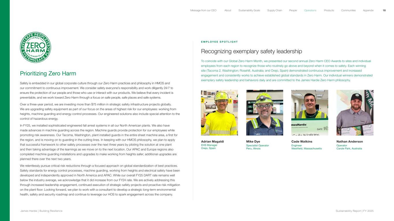 Prioritizing Zero Harm Safety is embedded in our global corporate culture through our Zero Harm practices and philosophy in HMOS and our commitment to continuous improvement. We consider safety everyone’s responsibility and work diligently 24/7 to ensure the protection of our people and those who use or interact with our products. We believe that every incident is preventable, and we work toward Zero Harm through a focus on safe people, safe places and safe systems. Over a three-year period, we are investing more than $75 million in strategic safety infrastructure projects globally. We are upgrading safety equipment as part of our focus on the areas of highest risk for our employees: working from heights, machine guarding and energy control processes. Our engineered solutions also include special attention to the control of hazardous energy. In FY25, we installed sophisticated engineered fall arrest systems in all our North American plants. We also have made advances in machine guarding across the region. Machine guards provide protection for our employees while promoting risk awareness. Our Tacoma, Washington, plant installed guards in the entire sheet machine area, a first for the region, and is moving on to guarding in the cutting lines. In keeping with our HMOS philosophy, we plan to apply that successful framework to other safety processes over the next three years by piloting the solution at one plant and then taking advantage of the learnings as we move on to the next location. Our APAC and Europe regions also completed machine guarding installations and upgrades to make working from heights safer; additional upgrades are planned there over the next two years. We relentlessly pursue critical risk reductions through a focused approach on global standardization of best practices. Safety standards for energy control processes, machine guarding, working from heights and electrical safety have been developed and independently approved in North America and APAC. While our overall FY25 DART rate remains well below the industry average, we acknowledge that it did increase from our FY24 rate. We are actively addressing this through increased leadership engagement, continued execution of strategic safety projects and proactive risk mitigation on the plant floor. Looking forward, we plan to work with a consultant to develop a strategic long-term environmental health, safety and security roadmap and continue to leverage our HOS to spark engagement across the company. E M P L O Y E E S P O T L I G H T Recognizing exemplary safety leadership To coincide with our Global Zero Harm Month, we presented our second annual Zero Harm CEO Awards to sites and individual employees from each region to recognize those who routinely go above and beyond when it comes to safety. Each winning site (Tacoma 2, Washington; Rosehill, Australia; and Orejo, Spain) demonstrated continuous improvement and increased engagement and consistently works to achieve established global standards in Zero Harm. Our individual winners demonstrated exemplary safety leadership and behaviors daily and are committed to the James Hardie Zero Harm philosophy. Adrian Magaldi EHS Manager Orejo, Spain Mike Dye Specialist Operator Peru, Illinois Cade Watkins Engineer Westfield, Massachusetts Nathan Anderson Operator Carole Park, Australia 18 James Hardie | Building Resilience Sustainability Repor t | FY 2025 About Sustainability Goals Supply Chain OperationsMessage from our CEO People Products Communities Appendix