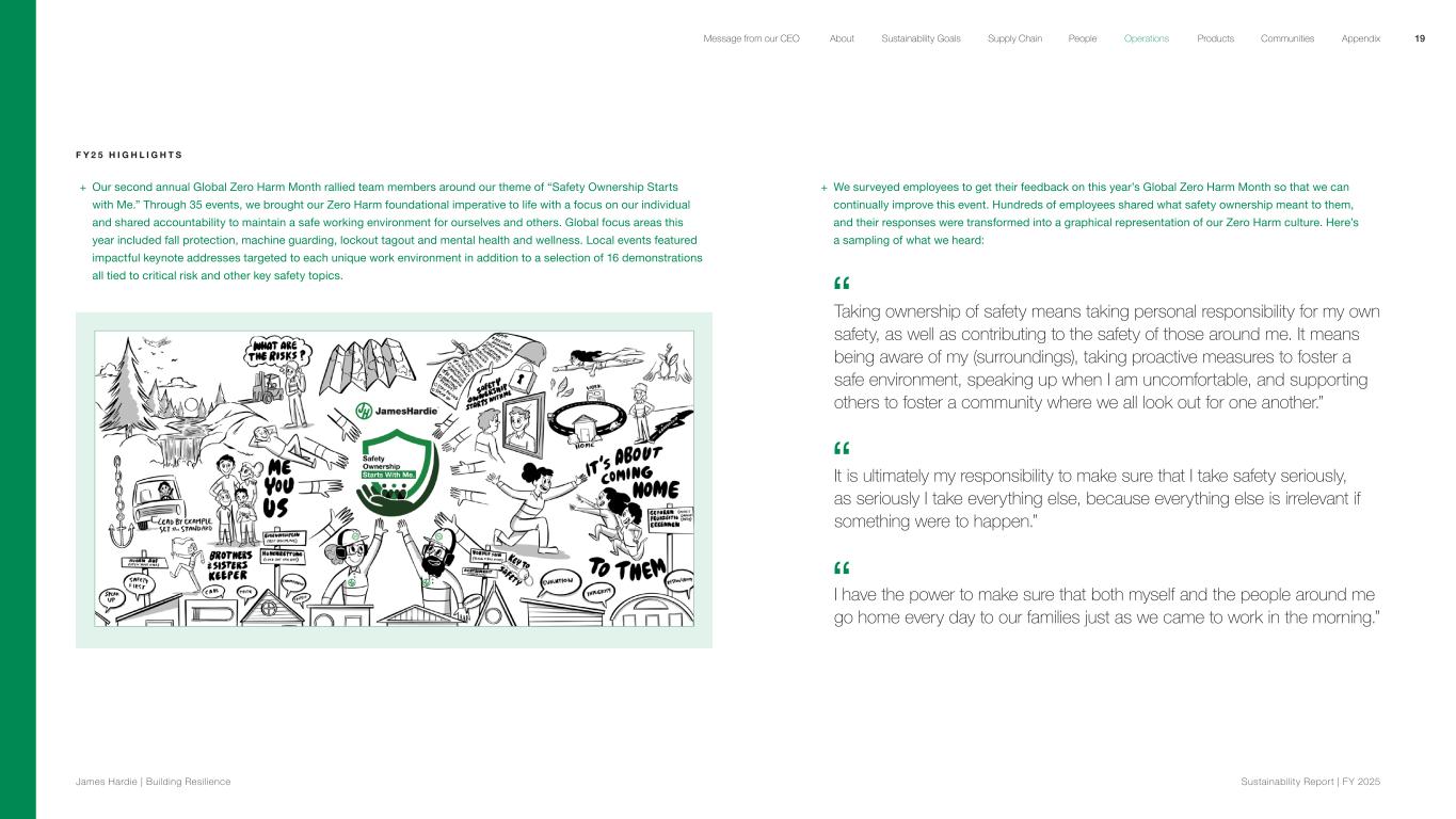 + We surveyed employees to get their feedback on this year’s Global Zero Harm Month so that we can continually improve this event. Hundreds of employees shared what safety ownership meant to them, and their responses were transformed into a graphical representation of our Zero Harm culture. Here’s a sampling of what we heard: Taking ownership of safety means taking personal responsibility for my own safety, as well as contributing to the safety of those around me. It means being aware of my (surroundings), taking proactive measures to foster a safe environment, speaking up when I am uncomfortable, and supporting others to foster a community where we all look out for one another.” It is ultimately my responsibility to make sure that I take safety seriously, as seriously I take everything else, because everything else is irrelevant if something were to happen.” I have the power to make sure that both myself and the people around me go home every day to our families just as we came to work in the morning.” F Y 2 5 H I G H L I G H T S + Our second annual Global Zero Harm Month rallied team members around our theme of “Safety Ownership Starts with Me.” Through 35 events, we brought our Zero Harm foundational imperative to life with a focus on our individual and shared accountability to maintain a safe working environment for ourselves and others. Global focus areas this year included fall protection, machine guarding, lockout tagout and mental health and wellness. Local events featured impactful keynote addresses targeted to each unique work environment in addition to a selection of 16 demonstrations all tied to critical risk and other key safety topics. 19 James Hardie | Building Resilience Sustainability Repor t | FY 2025 About Sustainability Goals Supply Chain OperationsMessage from our CEO People Products Communities Appendix