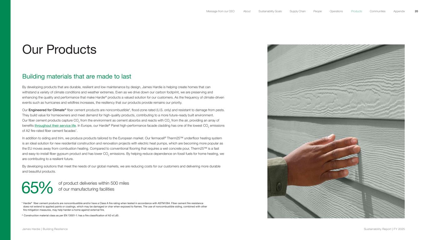 Our Products Building materials that are made to last By developing products that are durable, resilient and low maintenance by design, James Hardie is helping create homes that can withstand a variety of climate conditions and weather extremes. Even as we drive down our carbon footprint, we are preserving and enhancing the quality and performance that make Hardie® products a valued solution for our customers. As the frequency of climate-driven events such as hurricanes and wildfires increases, the resiliency that our products provide remains our priority. Our Engineered for Climate® fiber cement products are noncombustible*, flood-zone rated (U.S. only) and resistant to damage from pests. They build value for homeowners and meet demand for high-quality products, contributing to a more future-ready built environment. Our fiber cement products capture CO2 from the environment as cement absorbs and reacts with CO2 from the air, providing an array of benefits throughout their service life. In Europe, our Hardie® Panel high-performance facade cladding has one of the lowest CO2 emissions of A2 fire-rated fiber cement facades^. In addition to siding and trim, we produce products tailored to the European market. Our fermacell® Therm25™ underfloor heating system is an ideal solution for new residential construction and renovation projects with electric heat pumps, which are becoming more popular as the EU moves away from combustion heating. Compared to conventional flooring that requires a wet concrete pour, Therm25™ is a fast and easy-to-install fiber gypsum product and has lower CO2 emissions. By helping reduce dependence on fossil fuels for home heating, we are contributing to a resilient future. By developing solutions that meet the needs of our global markets, we are reducing costs for our customers and delivering more durable and beautiful products. 65% of product deliveries within 500 miles of our manufacturing facilities * Hardie® fiber cement products are noncombustible and/or have a Class A fire rating when tested in accordance with ASTM E84. Fiber cement fire resistance does not extend to applied paints or coatings, which may be damaged or char when exposed to flames. The use of noncombustible siding, combined with other fire mitigation measures, may help harden a home against external fire. ^ Construction material class as per EN 13501-1: has a fire classification of A2-s1,d0. 20 James Hardie | Building Resilience Sustainability Repor t | FY 2025 About Sustainability Goals Supply Chain OperationsMessage from our CEO People Products Communities Appendix