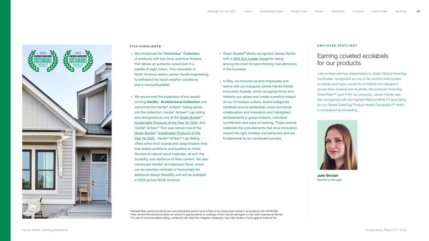 F Y 2 5 H I G H L I G H T S + We introduced the TimberHue™ Collection of products with two-tone, premium finishes that deliver an authentic wood-look in a palette of eight colors. This innovation in North America retains James Hardie engineering to withstand the harsh weather conditions and is noncombustible*. + We announced the expansion of our award- winning Hardie™ Architectural Collection and welcomed the Hardie® Artisan® Siding series into the collection. Hardie® Artisan® Lap siding was recognized as one of the Green Builder® Sustainable Products of the Year for 2024, and Hardie® Artisan® Trim was named one of the Green Builder® Sustainable Products of the Year for 2025.  Hardie® Artisan® Lap Siding offers extra thick boards and deep shadow lines that enable architects and builders to mimic the look of natural wood materials, all with the durability and resilience of fiber cement. We also introduced Hardie® Architectural Panel, which can be oriented vertically or horizontally for additional design flexibility and will be available in 2025 across North America. + Green Builder® Media recognized James Hardie with a 2024 Eco Leader Award for being among the most forward-thinking manufacturers in the business. + In May, we honored several employees and teams with our inaugural James Hardie Global Innovation Awards, which recognize those who embody our values and create a positive impact on our Innovation culture. Award categories centered around leadership, cross-functional collaboration and innovation and highlighted achievements in group projects, individual contribution and ways of working. These awards celebrate the core elements that drive innovation, reward the right mindset and behaviors and are fundamental to our continued success. E M P L O Y E E S P O T L I G H T Earning coveted ecolabels for our products Julie worked with key stakeholders to obtain Global GreenTag certificates, recognized as one of the world’s most trusted ecolabels and highly valued by architects and designers across New Zealand and Australia. We achieved GreenTag GreenRate™ Level A for our products. James Hardie was also recognized with the highest PlatinumHEALTH level rating for our Global GreenTag Product Health Declaration™ which is considered world-leading. Julie Sinclair Marketing Manager *Hardie® fiber cement products are noncombustible and/or have a Class A fire rating when tested in accordance with ASTM E84. Fiber cement fire resistance does not extend to applied paints or coatings, which may be damaged or char when exposed to flames. The use of noncombustible siding, combined with other fire mitigation measures, may help harden a home against external fire. 22 James Hardie | Building Resilience Sustainability Repor t | FY 2025 About Sustainability Goals Supply Chain OperationsMessage from our CEO People Products Communities Appendix