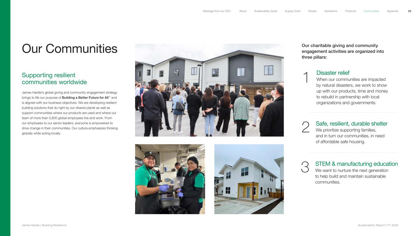 Our Communities Supporting resilient communities worldwide James Hardie’s global giving and community engagement strategy brings to life our purpose of Building a Better Future for All™ and is aligned with our business objectives. We are developing resilient building solutions that do right by our shared planet as well as support communities where our products are used and where our team of more than 5,800 global employees live and work. From our employees to our senior leaders, everyone is empowered to drive change in their communities. Our culture emphasizes thinking globally while acting locally. Our charitable giving and community engagement activities are organized into three pillars: Disaster relief When our communities are impacted by natural disasters, we work to show up with our products, time and money to rebuild in partnership with local organizations and governments. Safe, resilient, durable shelter We prioritize supporting families, and in turn our communities, in need of affordable safe housing. 1 2 3 STEM & manufacturing education We want to nurture the next generation to help build and maintain sustainable communities. 23 James Hardie | Building Resilience Sustainability Repor t | FY 2025 About Sustainability Goals Supply Chain OperationsMessage from our CEO People Products Communities Appendix