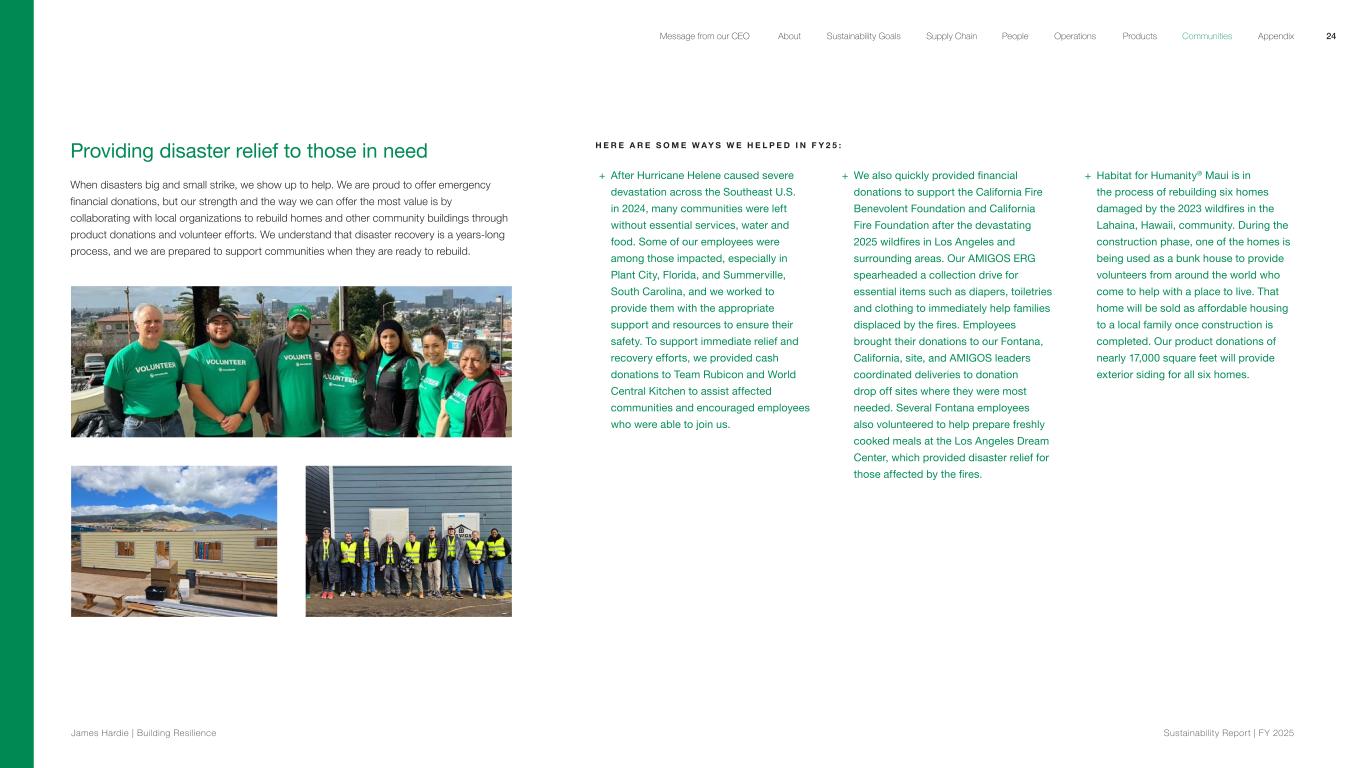 Providing disaster relief to those in need When disasters big and small strike, we show up to help. We are proud to offer emergency financial donations, but our strength and the way we can offer the most value is by collaborating with local organizations to rebuild homes and other community buildings through product donations and volunteer efforts. We understand that disaster recovery is a years-long process, and we are prepared to support communities when they are ready to rebuild. H E R E A R E S O M E W A Y S W E H E L P E D I N F Y 2 5 : + After Hurricane Helene caused severe devastation across the Southeast U.S. in 2024, many communities were left without essential services, water and food. Some of our employees were among those impacted, especially in Plant City, Florida, and Summerville, South Carolina, and we worked to provide them with the appropriate support and resources to ensure their safety. To support immediate relief and recovery efforts, we provided cash donations to Team Rubicon and World Central Kitchen to assist affected communities and encouraged employees who were able to join us. + We also quickly provided financial donations to support the California Fire Benevolent Foundation and California Fire Foundation after the devastating 2025 wildfires in Los Angeles and surrounding areas. Our AMIGOS ERG spearheaded a collection drive for essential items such as diapers, toiletries and clothing to immediately help families displaced by the fires. Employees brought their donations to our Fontana, California, site, and AMIGOS leaders coordinated deliveries to donation drop off sites where they were most needed. Several Fontana employees also volunteered to help prepare freshly cooked meals at the Los Angeles Dream Center, which provided disaster relief for those affected by the fires. + Habitat for Humanity® Maui is in the process of rebuilding six homes damaged by the 2023 wildfires in the Lahaina, Hawaii, community. During the construction phase, one of the homes is being used as a bunk house to provide volunteers from around the world who come to help with a place to live. That home will be sold as affordable housing to a local family once construction is completed. Our product donations of nearly 17,000 square feet will provide exterior siding for all six homes. 24 James Hardie | Building Resilience Sustainability Repor t | FY 2025 About Sustainability Goals Supply Chain OperationsMessage from our CEO People Products Communities Appendix