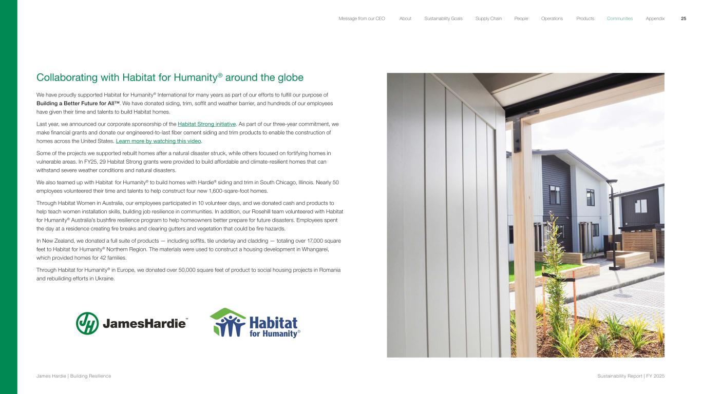 Collaborating with Habitat for Humanity® around the globe We have proudly supported Habitat for Humanity® International for many years as part of our efforts to fulfill our purpose of Building a Better Future for All™. We have donated siding, trim, soffit and weather barrier, and hundreds of our employees have given their time and talents to build Habitat homes. Last year, we announced our corporate sponsorship of the Habitat Strong initiative. As part of our three-year commitment, we make financial grants and donate our engineered-to-last fiber cement siding and trim products to enable the construction of homes across the United States. Learn more by watching this video. Some of the projects we supported rebuilt homes after a natural disaster struck, while others focused on fortifying homes in vulnerable areas. In FY25, 29 Habitat Strong grants were provided to build affordable and climate-resilient homes that can withstand severe weather conditions and natural disasters. We also teamed up with Habitat for Humanity® to build homes with Hardie® siding and trim in South Chicago, Illinois. Nearly 50 employees volunteered their time and talents to help construct four new 1,600-sqare-foot homes. Through Habitat Women in Australia, our employees participated in 10 volunteer days, and we donated cash and products to help teach women installation skills, building job resilience in communities. In addition, our Rosehill team volunteered with Habitat for Humanity® Australia’s bushfire resilience program to help homeowners better prepare for future disasters. Employees spent the day at a residence creating fire breaks and clearing gutters and vegetation that could be fire hazards. In New Zealand, we donated a full suite of products — including soffits, tile underlay and cladding — totaling over 17,000 square feet to Habitat for Humanity® Northern Region. The materials were used to construct a housing development in Whangarei, which provided homes for 42 families. Through Habitat for Humanity® in Europe, we donated over 50,000 square feet of product to social housing projects in Romania and rebuiliding efforts in Ukraine. 25 James Hardie | Building Resilience Sustainability Repor t | FY 2025 About Sustainability Goals Supply Chain OperationsMessage from our CEO People Products Communities Appendix