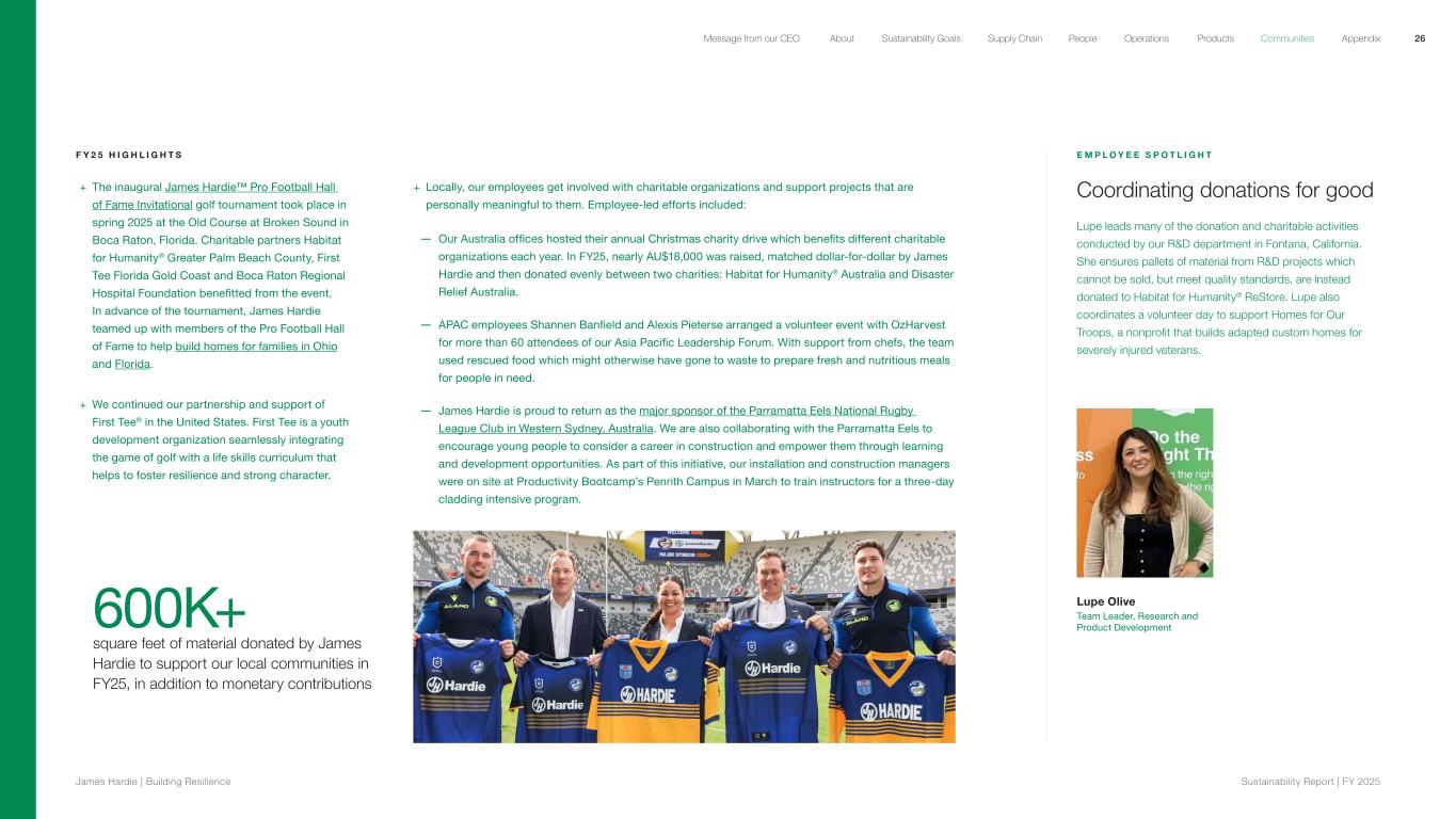 F Y 2 5 H I G H L I G H T S + The inaugural James Hardie™ Pro Football Hall of Fame Invitational golf tournament took place in spring 2025 at the Old Course at Broken Sound in Boca Raton, Florida. Charitable partners Habitat for Humanity® Greater Palm Beach County, First Tee Florida Gold Coast and Boca Raton Regional Hospital Foundation benefitted from the event. In advance of the tournament, James Hardie teamed up with members of the Pro Football Hall of Fame to help build homes for families in Ohio and Florida. + We continued our partnership and support of First Tee® in the United States. First Tee is a youth development organization seamlessly integrating the game of golf with a life skills curriculum that helps to foster resilience and strong character. 600K+ square feet of material donated by James Hardie to support our local communities in FY25, in addition to monetary contributions E M P L O Y E E S P O T L I G H T Coordinating donations for good Lupe leads many of the donation and charitable activities conducted by our R&D department in Fontana, California. She ensures pallets of material from R&D projects which cannot be sold, but meet quality standards, are instead donated to Habitat for Humanity® ReStore. Lupe also coordinates a volunteer day to support Homes for Our Troops, a nonprofit that builds adapted custom homes for severely injured veterans. Lupe Olive Team Leader, Research and Product Development + Locally, our employees get involved with charitable organizations and support projects that are personally meaningful to them. Employee-led efforts included: — Our Australia offices hosted their annual Christmas charity drive which benefits different charitable organizations each year. In FY25, nearly AU$18,000 was raised, matched dollar-for-dollar by James Hardie and then donated evenly between two charities: Habitat for Humanity® Australia and Disaster Relief Australia. — APAC employees Shannen Banfield and Alexis Pieterse arranged a volunteer event with OzHarvest for more than 60 attendees of our Asia Pacific Leadership Forum. With support from chefs, the team used rescued food which might otherwise have gone to waste to prepare fresh and nutritious meals for people in need. — James Hardie is proud to return as the major sponsor of the Parramatta Eels National Rugby League Club in Western Sydney, Australia. We are also collaborating with the Parramatta Eels to encourage young people to consider a career in construction and empower them through learning and development opportunities. As part of this initiative, our installation and construction managers were on site at Productivity Bootcamp’s Penrith Campus in March to train instructors for a three-day cladding intensive program. 26 James Hardie | Building Resilience Sustainability Repor t | FY 2025 About Sustainability Goals Supply Chain OperationsMessage from our CEO People Products Communities Appendix