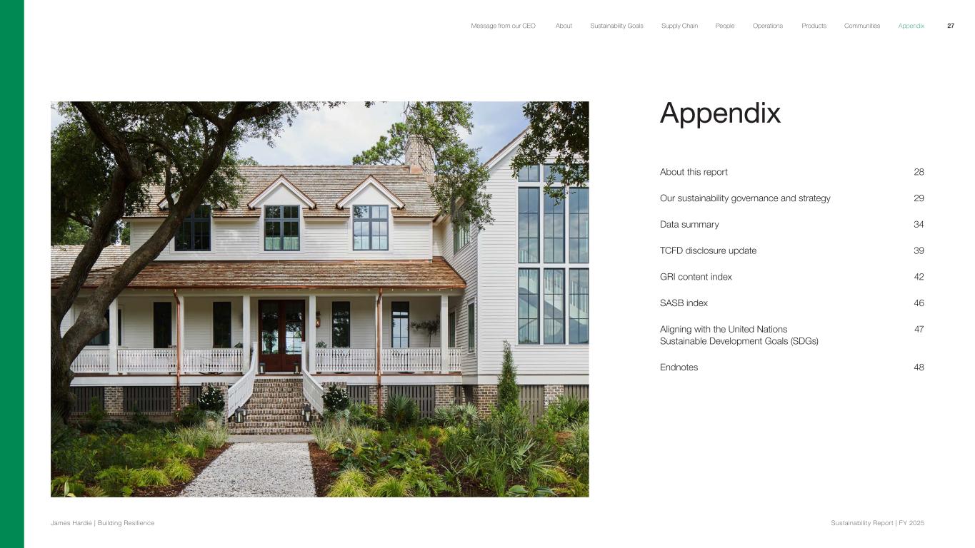 Appendix About this report 28 Our sustainability governance and strategy 29 Data summary 34 TCFD disclosure update 39 GRI content index 42 SASB index 46 Aligning with the United Nations 47 Sustainable Development Goals (SDGs) Endnotes 48 27 James Hardie | Building Resilience Sustainability Repor t | FY 2025 About Sustainability Goals Supply Chain OperationsMessage from our CEO People Products Communities Appendix