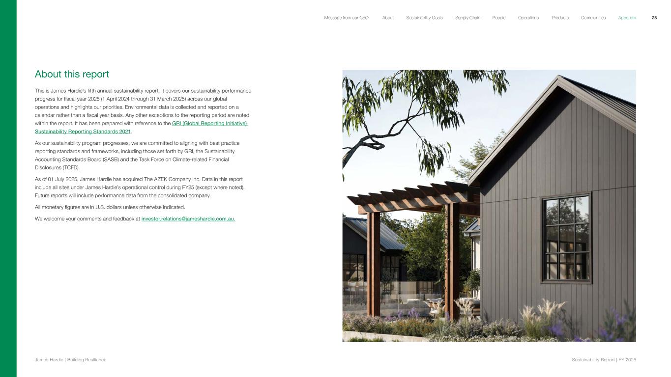 About this report This is James Hardie’s fifth annual sustainability report. It covers our sustainability performance progress for fiscal year 2025 (1 April 2024 through 31 March 2025) across our global operations and highlights our priorities. Environmental data is collected and reported on a calendar rather than a fiscal year basis. Any other exceptions to the reporting period are noted within the report. It has been prepared with reference to the GRI (Global Reporting Initiative) Sustainability Reporting Standards 2021. As our sustainability program progresses, we are committed to aligning with best practice reporting standards and frameworks, including those set forth by GRI, the Sustainability Accounting Standards Board (SASB) and the Task Force on Climate-related Financial Disclosures (TCFD). As of 01 July 2025, James Hardie has acquired The AZEK Company Inc. Data in this report include all sites under James Hardie’s operational control during FY25 (except where noted). Future reports will include performance data from the consolidated company. All monetary figures are in U.S. dollars unless otherwise indicated. We welcome your comments and feedback at investor.relations@jameshardie.com.au. 28 James Hardie | Building Resilience Sustainability Repor t | FY 2025 About Sustainability Goals Supply Chain OperationsMessage from our CEO People Products Communities Appendix