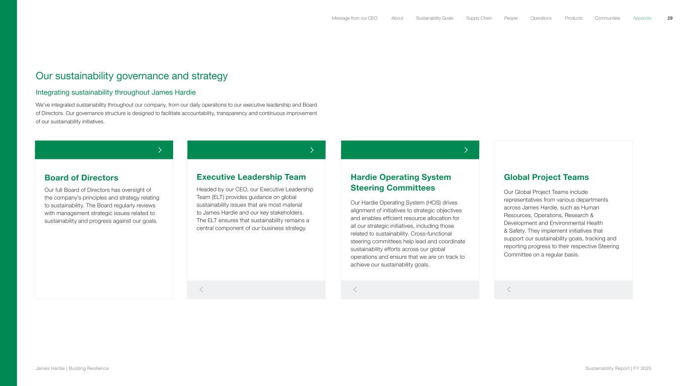 Board of Directors Our full Board of Directors has oversight of the company’s principles and strategy relating to sustainability. The Board regularly reviews with management strategic issues related to sustainability and progress against our goals. Executive Leadership Team Headed by our CEO, our Executive Leadership Team (ELT) provides guidance on global sustainability issues that are most material to James Hardie and our key stakeholders. The ELT ensures that sustainability remains a central component of our business strategy. Hardie Operating System Steering Committees Our Hardie Operating System (HOS) drives alignment of initiatives to strategic objectives and enables efficient resource allocation for all our strategic initiatives, including those related to sustainability. Cross-functional steering committees help lead and coordinate sustainability efforts across our global operations and ensure that we are on track to achieve our sustainability goals. Global Project Teams Our Global Project Teams include representatives from various departments across James Hardie, such as Human Resources, Operations, Research & Development and Environmental Health & Safety. They implement initiatives that support our sustainability goals, tracking and reporting progress to their respective Steering Committee on a regular basis. Our sustainability governance and strategy Integrating sustainability throughout James Hardie We’ve integrated sustainability throughout our company, from our daily operations to our executive leadership and Board of Directors. Our governance structure is designed to facilitate accountability, transparency and continuous improvement of our sustainability initiatives. 29 James Hardie | Building Resilience Sustainability Repor t | FY 2025 About Sustainability Goals Supply Chain OperationsMessage from our CEO People Products Communities Appendix