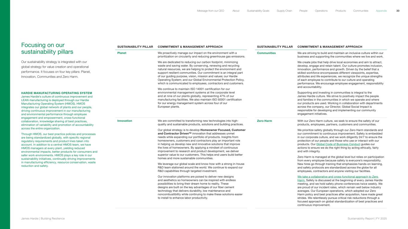Focusing on our sustainability pillars Our sustainability strategy is integrated with our global strategy for value creation and operational performance. It focuses on four key pillars: Planet, Innovation, Communities and Zero Harm. HARDIE MANUFACTURING OPERATING SYSTEM James Hardie’s culture of continuous improvement and LEAN manufacturing is deployed through our Hardie Manufacturing Operating System (HMOS). HMOS integrates our global network of plants and our people, driving continuous improvement in our manufacturing and environmental performance through employee engagement and empowerment, cross-functional collaboration, knowledge sharing of best practices, elimination of variability and promotion of accountability across the entire organization. Through HMOS, our best practice policies and processes are being standardized globally, with specific regional regulatory requirements and product lines taken into account. In addition to a central HMOS team, we have HMOS managers at every plant, yielding reduced environmental impacts, better products for consumers and safer work environments. HMOS plays a key role in our sustainability initiatives, continually driving improvements in manufacturing efficiency, resource conservation, waste reduction and safety. SUSTAINABILITY PILLAR COMMITMENT & MANAGEMENT APPROACH Planet We proactively manage our impact on the environment with a prioritization on circularity and reducing greenhouse gas emissions. We are dedicated to reducing our carbon footprint, minimizing waste and saving water. By conserving, renewing and recycling natural resources, we are helping to protect the environment and support resilient communities. Our commitment is an integral part of our guiding purpose, vision, mission and values; our Hardie Operating System; and our Global Environmental Protection Policy, which is communicated to employees, contractors and customers. We continue to maintain ISO 14001 certification for our environmental management systems at the corporate level and at nine of our plants globally, representing 47% of our manufacturing facilities. We also maintain ISO 50001 certification for our energy management system across four of our European plants. Innovation We are committed to transforming new technologies into high- quality and sustainable products, solutions and building practices. Our global strategy is to develop Homeowner Focused, Customer and Contractor Driven™ innovation that addresses unmet needs while expanding our portfolio of products. Insights from homeowners, customers and contractors play an important role in helping us develop new and innovative solutions that improve the lives of homeowners. By applying a mindset of continuous improvement to research and product development, we deliver superior value to our customers. This helps end users build better homes and more sustainable communities. We leverage our global scale and know-how with a strong in-house R&D team stationed around the world. We continue to expand our R&D capabilities through targeted investment. Our innovation platforms are poised to deliver new designs and aesthetics so homeowners can be inspired with endless possibilities to bring their dream home to reality. These designs are built on the key advantages of our fiber cement technology that delivers durability, low maintenance and noncombustibility while continuing to make these solutions easier to install to enhance labor productivity. SUSTAINABILITY PILLAR COMMITMENT & MANAGEMENT APPROACH Communities We are striving to build and maintain an inclusive culture within our business and supporting the communities where we live and work. We create jobs that help drive local economies and aim to attract, develop, engage and retain talent. Our culture promotes inclusion, innovation, performance and growth. Driven by the belief that a skilled workforce encompasses different viewpoints, expertise, attributes and life experiences, we recognize the unique strengths of each employee to contribute to our culture and operating performance. We encourage employee engagement, responsibility and accountability. Supporting and investing in communities is integral to the James Hardie culture. We strive to positively impact the people and families in the communities in which we operate and where our products are used. Working in collaboration with departments across the company, our Director, Global Social Impact is responsible for developing and implementing our community engagement initiatives. Zero Harm With our Zero Harm culture, we seek to ensure the safety of our products, employees, partners, customers and communities. We prioritize safety globally through our Zero Harm standards and our commitment to continuous improvement. Safety is embedded in our corporate culture, and we work diligently 24/7 to ensure the protection of our people and those who use or interact with our products. Our Global Code of Business Conduct guides our actions to ensure we do the right thing by acting ethically, fairly and with integrity. Zero Harm is managed at the global level but relies on participation from every employee because safety is everyone’s responsibility. New hires go through training that emphasizes hands-on learning, and safety protocols are standardized across the globe for all employees, contractors and anyone visiting our facilities. We take a collaborative and cross-functional approach to Zero Harm. Safety is discussed at the beginning of every James Hardie meeting, and we hold safety phone conferences twice weekly. We are proud of our incident rates, which remain well below industry averages. Our European operations, which adopted our Zero Harm policy and best practices after acquisition, have made great strides. We relentlessly pursue critical risk reductions through a focused approach on global standardization of best practices and continuous improvement. 30 James Hardie | Building Resilience Sustainability Repor t | FY 2025 