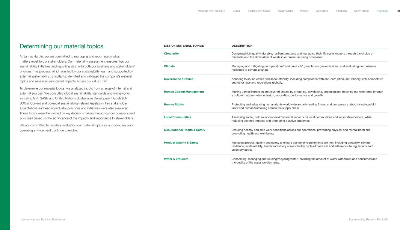 Determining our material topics At James Hardie, we are committed to managing and reporting on what matters most to our stakeholders. Our materiality assessment ensures that our sustainability initiatives and reporting align with both our business and stakeholders’ priorities. The process, which was led by our sustainability team and supported by external sustainability consultants, identified and validated the company’s material topics and assessed associated impacts across our value chain. To determine our material topics, we analyzed inputs from a range of internal and external sources. We consulted global sustainability standards and frameworks, including GRI, SASB and United Nations Sustainable Development Goals (UN SDGs). Current and potential sustainability-related legislation, key stakeholder expectations and leading industry practices and initiatives were also evaluated. These topics were then vetted by key decision-makers throughout our company and prioritized based on the significance of the impacts and importance to stakeholders. We are committed to regularly evaluating our material topics as our company and operating environment continue to evolve. LIST OF MATERIAL TOPICS DESCRIPTION Circularity Designing high-quality, durable, resilient products and managing their life cycle impacts through the choice of materials and the elimination of waste in our manufacturing processes. Climate Managing and mitigating our operations’ and products’ greenhouse gas emissions, and evaluating our business resilience to climate change. Governance & Ethics Adhering to sound ethics and accountability, including compliance with anti-corruption, anti-bribery, anti-competitive and other laws and regulations globally. Human Capital Management Making James Hardie an employer of choice by attracting, developing, engaging and retaining our workforce through a culture that promotes inclusion, innovation, performance and growth. Human Rights Protecting and advancing human rights worldwide and eliminating forced and compulsory labor, including child labor and human trafficking across the supply chain. Local Communities Assessing social, cultural and/or environmental impacts on local communities and wider stakeholders, while reducing adverse impacts and promoting positive outcomes. Occupational Health & Safety Ensuring healthy and safe work conditions across our operations, preventing physical and mental harm and promoting health and well-being. Product Quality & Safety Managing product quality and safety to ensure customer requirements are met, including durability, climate resilience, sustainability, health and safety across the life cycle of products and adherence to regulations and voluntary codes. Water & Effluents Conserving, managing and reusing/recycling water, including the amount of water withdrawn and consumed and the quality of the water we discharge. 31 James Hardie | Building Resilience Sustainability Repor t | FY 2025 About Sustainability Goals Supply Chain OperationsMessage from our CEO People Products Communities Appendix