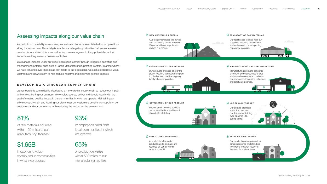 Assessing impacts along our value chain As part of our materiality assessment, we evaluated impacts associated with our operations along the value chain. This analysis enables us to target opportunities that enhance value creation for our stakeholders, as well as improve management of any potential or actual impacts resulting from our business activities. We manage impacts under our direct operational control through integrated operating and management systems, such as the Hardie Manufacturing Operating System. In areas where we have influence over impacts as they relate to our operations, we seek collaborative ways upstream and downstream to help reduce negative and maximize positive impacts. D E V E L O P I N G A C I R C U L A R S U P P LY C H A I N James Hardie is committed to developing a more circular supply chain to reduce our impact while strengthening our business. We employ, source, deliver and donate locally with the goal of creating positive impact in the communities in which we operate. Maintaining an efficient supply chain and locating our plants near our customers benefits our suppliers, our customers and our bottom line while reducing the impact on the environment. RAW MATERIALS & SUPPLY Our footprint includes the mining and processing of raw materials. We work with our suppliers to reduce our impact. TRANSPORT OF RAW MATERIALS Our facilities are located near our suppliers, reducing the distance and emissions from transporting dense raw materials. MANUFACTURING & GLOBAL OPERATIONS Manufacturing products generates emissions and waste, uses energy and natural resources and relies on our employees. Innovation, efficiency and safety are priorities. DISTRIBUTION OF OUR PRODUCT Our products are used all over the globe, requiring transport from plant to job site. We prioritize shipping locally wherever possible. INSTALLATION OF OUR PRODUCT Efficient and innovative solutions can reduce the time and impact of product installation. CO2 Our products are engineered for climate resilience and stand up to extreme weather, reducing the need for maintenance. USE OF OUR PRODUCT Our durable products are built to last, and our fiber cement siding even absorbs CO2 during its life. PRODUCT MAINTENANCEDEMOLITION AND DISPOSAL At end of life, dismantled products are taken back and recycled by James Hardie or sent to landfill. 81% of raw materials sourced within 150 miles of our manufacturing facilities 93% of employees hired from local communities in which we operate $1.65B in economic value contributed in communities in which we operate 65% of product deliveries within 500 miles of our manufacturing facilities 32 James Hardie | Building Resilience Sustainability Repor t | FY 2025 About Sustainability Goals Supply Chain OperationsMessage from our CEO People Products Communities Appendix