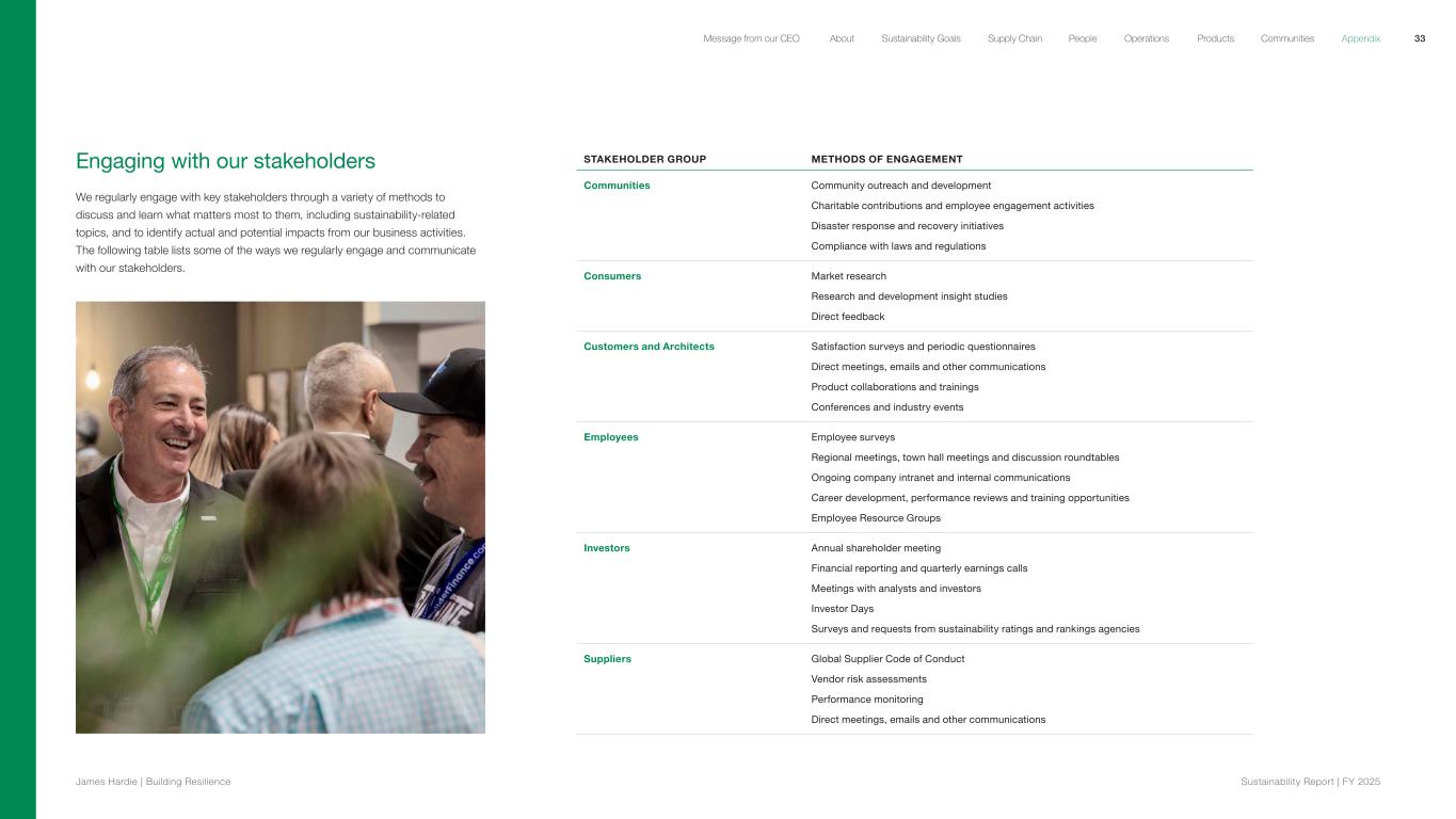 Engaging with our stakeholders We regularly engage with key stakeholders through a variety of methods to discuss and learn what matters most to them, including sustainability-related topics, and to identify actual and potential impacts from our business activities. The following table lists some of the ways we regularly engage and communicate with our stakeholders. STAKEHOLDER GROUP METHODS OF ENGAGEMENT Communities Community outreach and development Charitable contributions and employee engagement activities Disaster response and recovery initiatives Compliance with laws and regulations Consumers Market research Research and development insight studies Direct feedback Customers and Architects Satisfaction surveys and periodic questionnaires Direct meetings, emails and other communications Product collaborations and trainings  Conferences and industry events Employees Employee surveys Regional meetings, town hall meetings and discussion roundtables Ongoing company intranet and internal communications Career development, performance reviews and training opportunities Employee Resource Groups Investors Annual shareholder meeting Financial reporting and quarterly earnings calls Meetings with analysts and investors Investor Days Surveys and requests from sustainability ratings and rankings agencies Suppliers Global Supplier Code of Conduct Vendor risk assessments Performance monitoring Direct meetings, emails and other communications 33 James Hardie | Building Resilience Sustainability Repor t | FY 2025 About Sustainability Goals Supply Chain OperationsMessage from our CEO People Products Communities Appendix