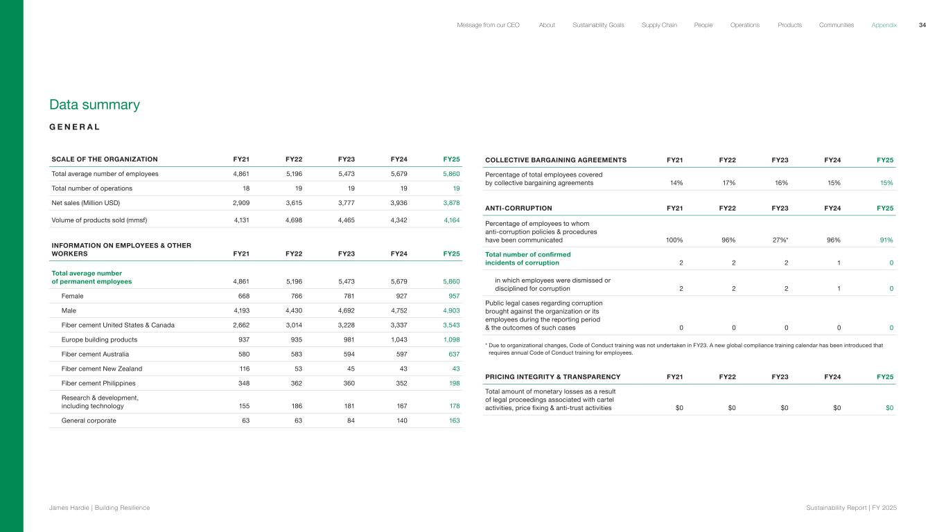 Data summary G E N E R A L SCALE OF THE ORGANIZATION FY21 FY22 FY23 FY24 FY25 Total average number of employees 4,861 5,196 5,473 5,679 5,860 Total number of operations 18 19 19 19 19 Net sales (Million USD) 2,909 3,615 3,777 3,936 3,878 Volume of products sold (mmsf) 4,131 4,698 4,465 4,342 4,164 INFORMATION ON EMPLOYEES & OTHER WORKERS FY21 FY22 FY23 FY24 FY25 Total average number of permanent employees 4,861 5,196 5,473 5,679 5,860 Female 668 766 781 927 957 Male 4,193 4,430 4,692 4,752 4,903 Fiber cement United States & Canada 2,662 3,014 3,228 3,337 3,543 Europe building products 937 935 981 1,043 1,098 Fiber cement Australia 580 583 594 597 637 Fiber cement New Zealand 116 53 45 43 43 Fiber cement Philippines 348 362 360 352 198 Research & development, including technology 155 186 181 167 178 General corporate 63 63 84 140 163 COLLECTIVE BARGAINING AGREEMENTS FY21 FY22 FY23 FY24 FY25 Percentage of total employees covered by collective bargaining agreements 14% 17% 16% 15% 15% ANTI-CORRUPTION FY21 FY22 FY23 FY24 FY25 Percentage of employees to whom anti-corruption policies & procedures have been communicated 100% 96% 27%* 96% 91% Total number of confirmed incidents of corruption 2 2 2 1 0 in which employees were dismissed or disciplined for corruption 2 2 2 1 0 Public legal cases regarding corruption brought against the organization or its employees during the reporting period & the outcomes of such cases 0 0 0 0 0 * Due to organizational changes, Code of Conduct training was not undertaken in FY23. A new global compliance training calendar has been introduced that requires annual Code of Conduct training for employees. PRICING INTEGRITY & TRANSPARENCY FY21 FY22 FY23 FY24 FY25 Total amount of monetary losses as a result of legal proceedings associated with cartel activities, price fixing & anti-trust activities $0 $0 $0 $0 $0 34 James Hardie | Building Resilience Sustainability Repor t | FY 2025 About Sustainability Goals Supply Chain OperationsMessage from our CEO People Products Communities Appendix