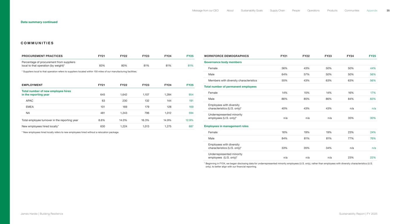 Data summary continued C O M M U N I T I E S PROCUREMENT PRACTICES FY21 FY22 FY23 FY24 FY25 Percentage of procurement from suppliers local to that operation (by weight)* 83% 80% 81% 81% 81% * Suppliers local to that operation refers to suppliers located within 150 miles of our manufacturing facilities. EMPLOYMENT FY21 FY22 FY23 FY24 FY25 Total number of new employee hires in the reporting year 645 1,642 1,107 1,284 954 APAC 63 230 132 144 191 EMEA 101 169 179 128 169 NA 481 1,243 796 1,012 594 Total employee turnover in the reporting year 8.6% 14.0% 16.3% 14.9% 12.9% New employees hired locally* 630 1,224 1,013 1,275 887 * New employees hired locally refers to new employees hired without a relocation package. WORKFORCE DEMOGRAPHICS FY21 FY22 FY23 FY24 FY25 Governance body members Female 36% 43% 50% 50% 44% Male 64% 57% 50% 50% 56% Members with diversity characteristics 55% 43% 63% 63% 56% Total number of permanent employees Female 14% 15% 14% 16% 17% Male 86% 85% 86% 84% 83% Employees with diversity characteristics (U.S. only)* 40% 43% 43% n/a n/a Underrepresented minority employees (U.S. only)* n/a n/a n/a 35% 30% Employees in management roles Female 16% 19% 19% 23% 24% Male 84% 81% 81% 77% 76% Employees with diversity characteristics (U.S. only)* 33% 35% 34% n/a n/a Underrepresented minority employees (U.S. only)* n/a n/a n/a 23% 22% * Beginning in FY24, we began disclosing data for underrepresented minority employees (U.S. only), rather than employees with diversity characteristics (U.S. only), to better align with our financial reporting. 35 James Hardie | Building Resilience Sustainability Repor t | FY 2025 About Sustainability Goals Supply Chain OperationsMessage from our CEO People Products Communities Appendix