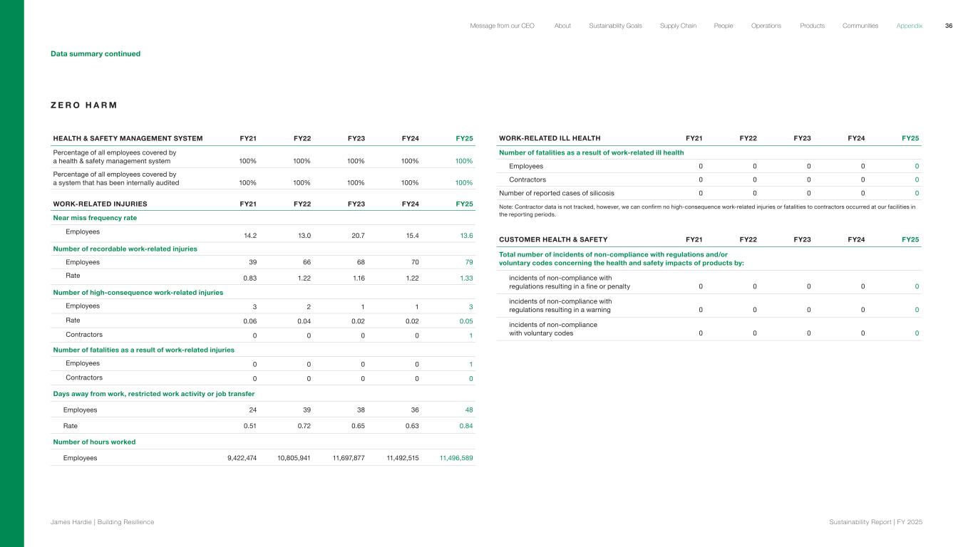 Data summary continued Z E R O H A R M HEALTH & SAFETY MANAGEMENT SYSTEM FY21 FY22 FY23 FY24 FY25 Percentage of all employees covered by a health & safety management system 100% 100% 100% 100% 100% Percentage of all employees covered by a system that has been internally audited 100% 100% 100% 100% 100% WORK-RELATED INJURIES FY21 FY22 FY23 FY24 FY25 Near miss frequency rate Employees 14.2 13.0 20.7 15.4 13.6 Number of recordable work-related injuries Employees 39 66 68 70 79 Rate 0.83 1.22 1.16 1.22 1.33 Number of high-consequence work-related injuries Employees 3 2 1 1 3 Rate 0.06 0.04 0.02 0.02 0.05 Contractors 0 0 0 0 1 Number of fatalities as a result of work-related injuries Employees 0 0 0 0 1 Contractors 0 0 0 0 0 Days away from work, restricted work activity or job transfer Employees 24 39 38 36 48 Rate 0.51 0.72 0.65 0.63 0.84 Number of hours worked Employees 9,422,474 10,805,941 11,697,877 11,492,515 11,496,589 WORK-RELATED ILL HEALTH FY21 FY22 FY23 FY24 FY25 Number of fatalities as a result of work-related ill health Employees 0 0 0 0 0 Contractors 0 0 0 0 0 Number of reported cases of silicosis 0 0 0 0 0 Note: Contractor data is not tracked, however, we can confirm no high-consequence work-related injuries or fatalities to contractors occurred at our facilities in the reporting periods. CUSTOMER HEALTH & SAFETY FY21 FY22 FY23 FY24 FY25 Total number of incidents of non-compliance with regulations and/or voluntary codes concerning the health and safety impacts of products by: incidents of non-compliance with regulations resulting in a fine or penalty 0 0 0 0 0 incidents of non-compliance with regulations resulting in a warning 0 0 0 0 0 incidents of non-compliance with voluntary codes 0 0 0 0 0 36 James Hardie | Building Resilience Sustainability Repor t | FY 2025 About Sustainability Goals Supply Chain OperationsMessage from our CEO People Products Communities Appendix