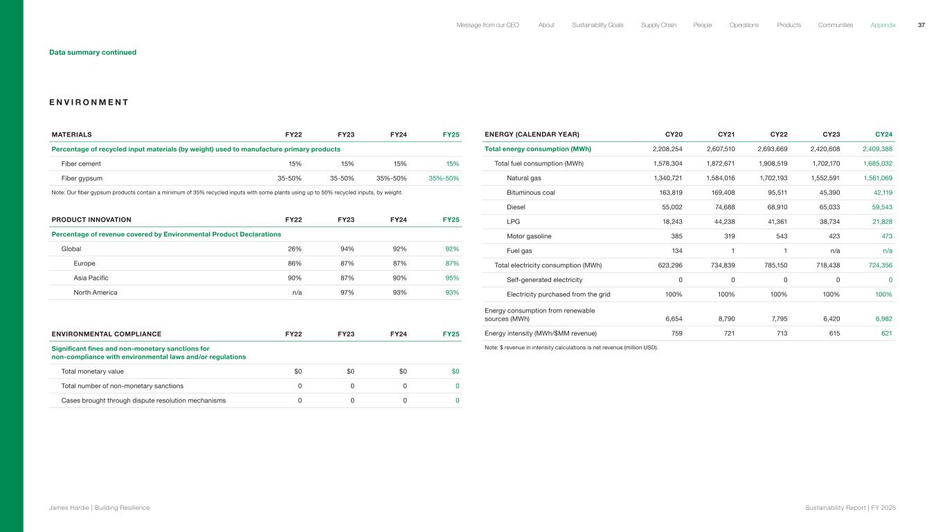 E N V I R O N M E N T MATERIALS FY22 FY23 FY24 FY25 Percentage of recycled input materials (by weight) used to manufacture primary products Fiber cement 15% 15% 15% 15% Fiber gypsum 35-50% 35-50% 35%-50% 35%-50% Note: Our fiber gypsum products contain a minimum of 35% recycled inputs with some plants using up to 50% recycled inputs, by weight. PRODUCT INNOVATION FY22 FY23 FY24 FY25 Percentage of revenue covered by Environmental Product Declarations Global 26% 94% 92% 92% Europe 86% 87% 87% 87% Asia Pacific 90% 87% 90% 95% North America n/a 97% 93% 93% ENVIRONMENTAL COMPLIANCE FY22 FY23 FY24 FY25 Significant fines and non-monetary sanctions for non-compliance with environmental laws and/or regulations Total monetary value $0 $0 $0 $0 Total number of non-monetary sanctions 0 0 0 0 Cases brought through dispute resolution mechanisms 0 0 0 0 ENERGY (CALENDAR YEAR) CY20 CY21 CY22 CY23 CY24 Total energy consumption (MWh) 2,208,254 2,607,510 2,693,669 2,420,608 2,409,388 Total fuel consumption (MWh) 1,578,304 1,872,671 1,908,519 1,702,170 1,685,032 Natural gas 1,340,721 1,584,016 1,702,193 1,552,591 1,561,069 Bituminous coal 163,819 169,408 95,511 45,390 42,119 Diesel 55,002 74,688 68,910 65,033 59,543 LPG 18,243 44,238 41,361 38,734 21,828 Motor gasoline 385 319 543 423 473 Fuel gas 134 1 1 n/a n/a Total electricity consumption (MWh) 623,296 734,839 785,150 718,438 724,356 Self-generated electricity 0 0 0 0 0 Electricity purchased from the grid 100% 100% 100% 100% 100% Energy consumption from renewable sources (MWh) 6,654 8,790 7,795 6,420 6,982 Energy intensity (MWh/$MM revenue) 759 721 713 615 621 Note: $ revenue in intensity calculations is net revenue (million USD). Data summary continued 37 James Hardie | Building Resilience Sustainability Repor t | FY 2025 About Sustainability Goals Supply Chain OperationsMessage from our CEO People Products Communities Appendix