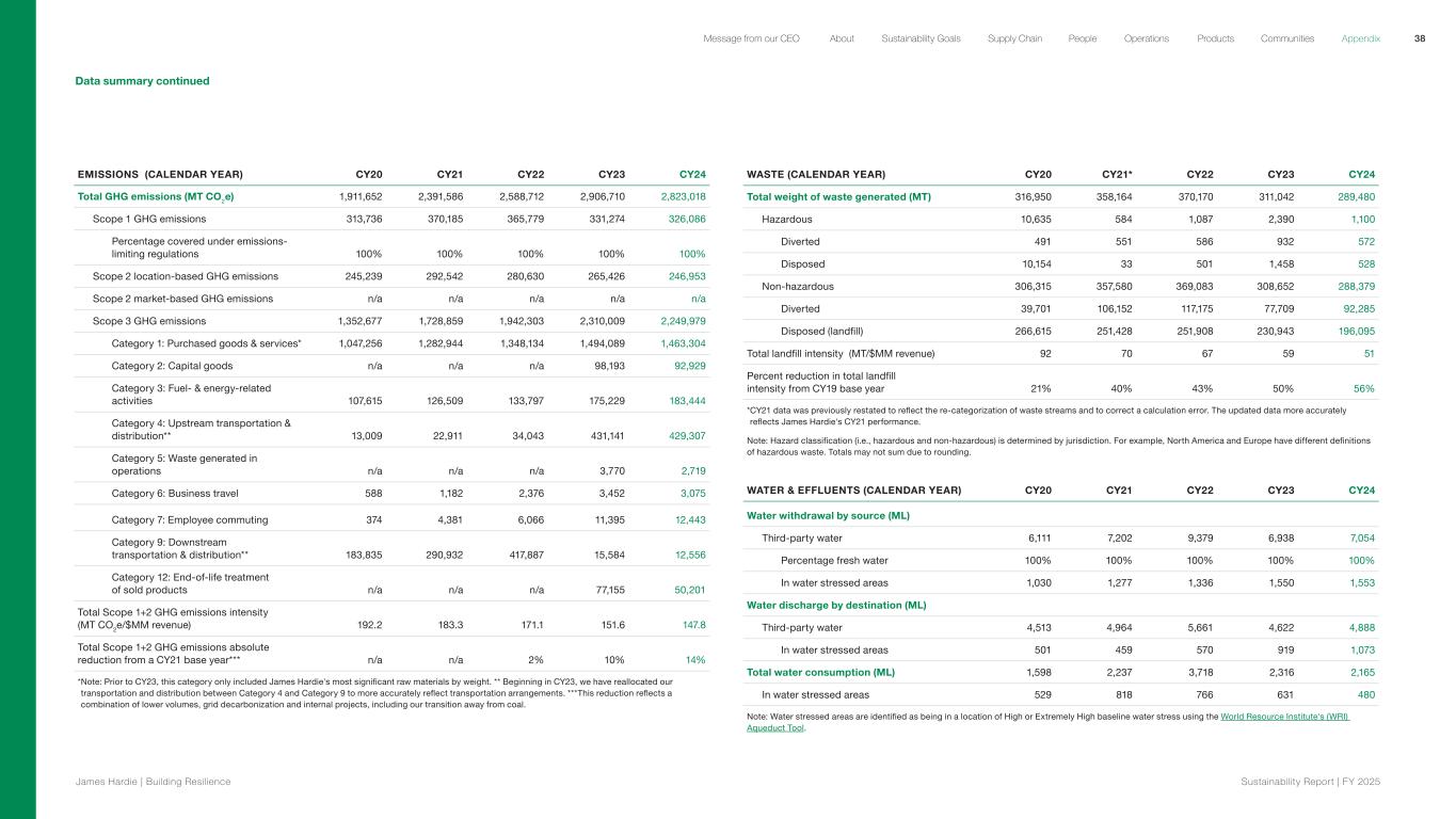 Data summary continued EMISSIONS (CALENDAR YEAR) CY20 CY21 CY22 CY23 CY24 Total GHG emissions (MT CO2e) 1,911,652 2,391,586 2,588,712 2,906,710 2,823,018 Scope 1 GHG emissions 313,736 370,185 365,779 331,274 326,086 Percentage covered under emissions- limiting regulations 100% 100% 100% 100% 100% Scope 2 location-based GHG emissions 245,239 292,542 280,630 265,426 246,953 Scope 2 market-based GHG emissions n/a n/a n/a n/a n/a Scope 3 GHG emissions 1,352,677 1,728,859 1,942,303 2,310,009 2,249,979 Category 1: Purchased goods & services* 1,047,256 1,282,944 1,348,134 1,494,089 1,463,304 Category 2: Capital goods n/a n/a n/a 98,193 92,929 Category 3: Fuel- & energy-related activities 107,615 126,509 133,797 175,229 183,444 Category 4: Upstream transportation & distribution** 13,009 22,911 34,043 431,141 429,307 Category 5: Waste generated in operations n/a n/a n/a 3,770 2,719 Category 6: Business travel 588 1,182 2,376 3,452 3,075 Category 7: Employee commuting 374 4,381 6,066 11,395 12,443 Category 9: Downstream transportation & distribution** 183,835 290,932 417,887 15,584 12,556 Category 12: End-of-life treatment of sold products n/a n/a n/a 77,155 50,201 Total Scope 1+2 GHG emissions intensity (MT CO2e/$MM revenue) 192.2 183.3 171.1 151.6 147.8 Total Scope 1+2 GHG emissions absolute reduction from a CY21 base year*** n/a n/a 2% 10% 14% *Note: Prior to CY23, this category only included James Hardie's most significant raw materials by weight. ** Beginning in CY23, we have reallocated our transportation and distribution between Category 4 and Category 9 to more accurately reflect transportation arrangements. ***This reduction reflects a combination of lower volumes, grid decarbonization and internal projects, including our transition away from coal. WASTE (CALENDAR YEAR) CY20 CY21* CY22 CY23 CY24 Total weight of waste generated (MT) 316,950 358,164 370,170 311,042 289,480 Hazardous 10,635 584 1,087 2,390 1,100 Diverted 491 551 586 932 572 Disposed 10,154 33 501 1,458 528 Non-hazardous 306,315 357,580 369,083 308,652 288,379 Diverted 39,701 106,152 117,175 77,709 92,285 Disposed (landfill) 266,615 251,428 251,908 230,943 196,095 Total landfill intensity (MT/$MM revenue) 92 70 67 59 51 Percent reduction in total landfill intensity from CY19 base year 21% 40% 43% 50% 56% *CY21 data was previously restated to reflect the re-categorization of waste streams and to correct a calculation error. The updated data more accurately reflects James Hardie's CY21 performance. Note: Hazard classification (i.e., hazardous and non-hazardous) is determined by jurisdiction. For example, North America and Europe have different definitions of hazardous waste. Totals may not sum due to rounding. WATER & EFFLUENTS (CALENDAR YEAR) CY20 CY21 CY22 CY23 CY24 Water withdrawal by source (ML) Third-party water 6,111 7,202 9,379 6,938 7,054 Percentage fresh water 100% 100% 100% 100% 100% In water stressed areas 1,030 1,277 1,336 1,550 1,553 Water discharge by destination (ML) Third-party water 4,513 4,964 5,661 4,622 4,888 In water stressed areas 501 459 570 919 1,073 Total water consumption (ML) 1,598 2,237 3,718 2,316 2,165 In water stressed areas 529 818 766 631 480 Note: Water stressed areas are identified as being in a location of High or Extremely High baseline water stress using the World Resource Institute's (WRI) Aqueduct Tool. 38 James Hardie | Building Resilience Sustainability Repor t | FY 2025 About Sustainability Goals Supply Chain OperationsMessage from our CEO People Products Communities Appendix