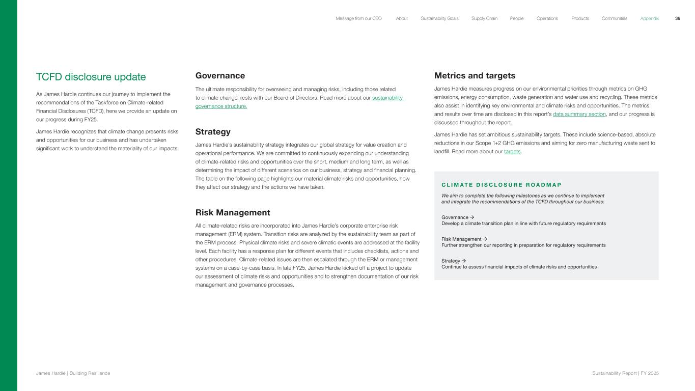 TCFD disclosure update As James Hardie continues our journey to implement the recommendations of the Taskforce on Climate-related Financial Disclosures (TCFD), here we provide an update on our progress during FY25. James Hardie recognizes that climate change presents risks and opportunities for our business and has undertaken significant work to understand the materiality of our impacts. Governance The ultimate responsibility for overseeing and managing risks, including those related to climate change, rests with our Board of Directors. Read more about our sustainability governance structure. Strategy James Hardie’s sustainability strategy integrates our global strategy for value creation and operational performance. We are committed to continuously expanding our understanding of climate-related risks and opportunities over the short, medium and long term, as well as determining the impact of different scenarios on our business, strategy and financial planning. The table on the following page highlights our material climate risks and opportunities, how they affect our strategy and the actions we have taken. Risk Management All climate-related risks are incorporated into James Hardie’s corporate enterprise risk management (ERM) system. Transition risks are analyzed by the sustainability team as part of the ERM process. Physical climate risks and severe climatic events are addressed at the facility level. Each facility has a response plan for different events that includes checklists, actions and other procedures. Climate-related issues are then escalated through the ERM or management systems on a case-by-case basis. In late FY25, James Hardie kicked off a project to update our assessment of climate risks and opportunities and to strengthen documentation of our risk management and governance processes. Metrics and targets James Hardie measures progress on our environmental priorities through metrics on GHG emissions, energy consumption, waste generation and water use and recycling. These metrics also assist in identifying key environmental and climate risks and opportunities. The metrics and results over time are disclosed in this report’s data summary section, and our progress is discussed throughout the report. James Hardie has set ambitious sustainability targets. These include science-based, absolute reductions in our Scope 1+2 GHG emissions and aiming for zero manufacturing waste sent to landfill. Read more about our targets. C L I M A T E D I S C L O S U R E R O A D M A P We aim to complete the following milestones as we continue to implement and integrate the recommendations of the TCFD throughout our business: Governance  Develop a climate transition plan in line with future regulatory requirements Risk Management  Further strengthen our reporting in preparation for regulatory requirements Strategy  Continue to assess financial impacts of climate risks and opportunities 39 James Hardie | Building Resilience Sustainability Repor t | FY 2025 About Sustainability Goals Supply Chain OperationsMessage from our CEO People Products Communities Appendix