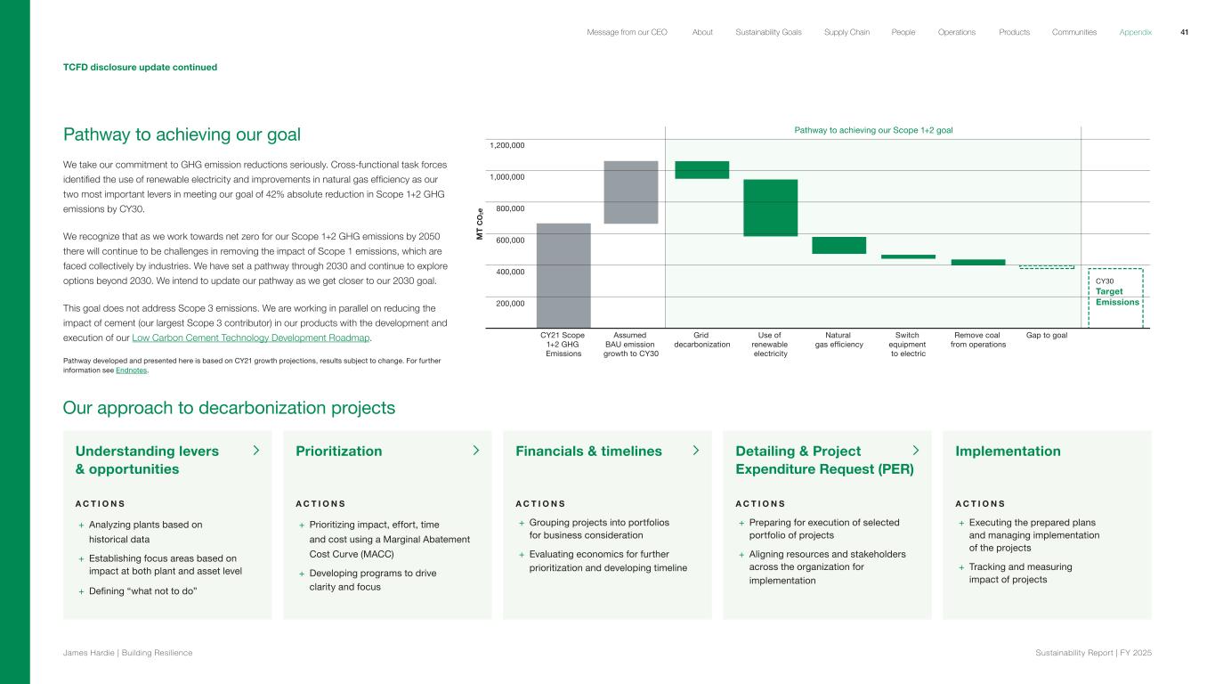 200,000 400,000 600,000 800,000 1,000,000 1,200,000 CY21 Scope 1+2 GHG Emissions Assumed BAU emission growth to CY30 Grid decarbonization Use of renewable electricity Natural gas efficiency Switch equipment to electric Remove coal from operations Gap to goal CY30 Target Emissions M T C O 2e Pathway to achieving our Scope 1+2 goalPathway to achieving our goal We take our commitment to GHG emission reductions seriously. Cross-functional task forces identified the use of renewable electricity and improvements in natural gas efficiency as our two most important levers in meeting our goal of 42% absolute reduction in Scope 1+2 GHG emissions by CY30. We recognize that as we work towards net zero for our Scope 1+2 GHG emissions by 2050 there will continue to be challenges in removing the impact of Scope 1 emissions, which are faced collectively by industries. We have set a pathway through 2030 and continue to explore options beyond 2030. We intend to update our pathway as we get closer to our 2030 goal. This goal does not address Scope 3 emissions. We are working in parallel on reducing the impact of cement (our largest Scope 3 contributor) in our products with the development and execution of our Low Carbon Cement Technology Development Roadmap. Pathway developed and presented here is based on CY21 growth projections, results subject to change. For further information see Endnotes. TCFD disclosure update continued Our approach to decarbonization projects Understanding levers & opportunities A C T I O N S + Analyzing plants based on historical data + Establishing focus areas based on impact at both plant and asset level + Defining “what not to do” Prioritization A C T I O N S + Prioritizing impact, effort, time and cost using a Marginal Abatement Cost Curve (MACC) + Developing programs to drive clarity and focus Financials & timelines A C T I O N S + Grouping projects into portfolios for business consideration + Evaluating economics for further prioritization and developing timeline Detailing & Project Expenditure Request (PER) A C T I O N S + Preparing for execution of selected portfolio of projects + Aligning resources and stakeholders across the organization for implementation Implementation A C T I O N S + Executing the prepared plans and managing implementation of the projects + Tracking and measuring impact of projects 41 James Hardie | Building Resilience Sustainability Repor t | FY 2025 About Sustainability Goals Supply Chain OperationsMessage from our CEO People Products Communities Appendix