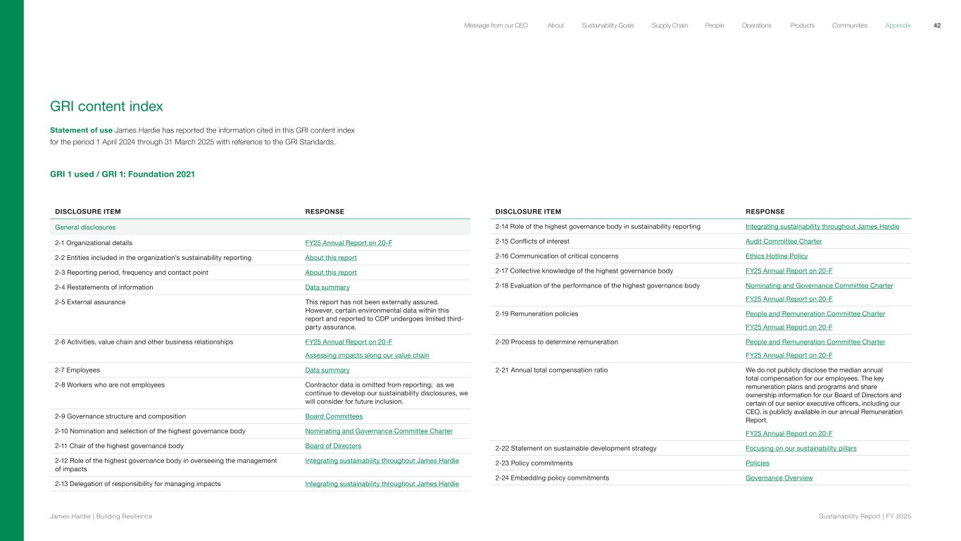 GRI content index Statement of use James Hardie has reported the information cited in this GRI content index for the period 1 April 2024 through 31 March 2025 with reference to the GRI Standards. GRI 1 used / GRI 1: Foundation 2021 DISCLOSURE ITEM RESPONSE 2-14 Role of the highest governance body in sustainability reporting Integrating sustainability throughout James Hardie 2-15 Conflicts of interest Audit Committee Charter 2-16 Communication of critical concerns Ethics Hotline Policy 2-17 Collective knowledge of the highest governance body FY25 Annual Report on 20-F 2-18 Evaluation of the performance of the highest governance body Nominating and Governance Committee Charter FY25 Annual Report on 20-F 2-19 Remuneration policies People and Remuneration Committee Charter FY25 Annual Report on 20-F 2-20 Process to determine remuneration People and Remuneration Committee Charter FY25 Annual Report on 20-F 2-21 Annual total compensation ratio We do not publicly disclose the median annual total compensation for our employees. The key remuneration plans and programs and share ownership information for our Board of Directors and certain of our senior executive officers, including our CEO, is publicly available in our annual Remuneration Report. FY25 Annual Report on 20-F 2-22 Statement on sustainable development strategy Focusing on our sustainability pillars 2-23 Policy commitments Policies 2-24 Embedding policy commitments Governance Overview DISCLOSURE ITEM RESPONSE General disclosures 2-1 Organizational details FY25 Annual Report on 20-F 2-2 Entities included in the organization’s sustainability reporting About this report 2-3 Reporting period, frequency and contact point About this report 2-4 Restatements of information Data summary 2-5 External assurance This report has not been externally assured. However, certain environmental data within this report and reported to CDP undergoes limited third- party assurance. 2-6 Activities, value chain and other business relationships FY25 Annual Report on 20-F Assessing impacts along our value chain 2-7 Employees Data summary 2-8 Workers who are not employees Contractor data is omitted from reporting; as we continue to develop our sustainability disclosures, we will consider for future inclusion. 2-9 Governance structure and composition Board Committees 2-10 Nomination and selection of the highest governance body Nominating and Governance Committee Charter 2-11 Chair of the highest governance body Board of Directors 2-12 Role of the highest governance body in overseeing the management of impacts Integrating sustainability throughout James Hardie 2-13 Delegation of responsibility for managing impacts Integrating sustainability throughout James Hardie 42 James Hardie | Building Resilience Sustainability Repor t | FY 2025 About Sustainability Goals Supply Chain OperationsMessage from our CEO People Products Communities Appendix