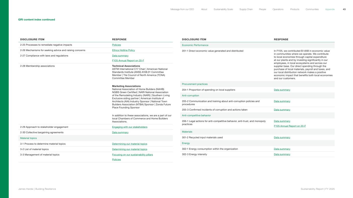 DISCLOSURE ITEM RESPONSE 2-25 Processes to remediate negative impacts Policies 2-26 Mechanisms for seeking advice and raising concerns Ethics Hotline Policy 2-27 Compliance with laws and regulations Data summary FY25 Annual Report on 20-F 2-28 Membership associations Technical Associations ASTM International C17 Chair | American National Standards Institute (ANSI) A108.01 Committee Member | Tile Council of North America (TCNA) Committee Member Marketing Associations National Association of Home Builders (NAHB) NGBS Green Certified | NARI National Association of the Remodeling Industry (NARI) | Southern Living Exclusive siding partner | American Institute of Architects (AIA) Industry Sponsor | National Town Builders Association (NTBA) Sponsor | Zonda Future Place Founding Sponsor In addition to these associations, we are a part of our local Chambers of Commerce and Home Builders Associations. 2-29 Approach to stakeholder engagement Engaging with our stakeholders 2-30 Collective bargaining agreements Data summary Material topics 3-1 Process to determine material topics Determining our material topics 3-2 List of material topics Determining our material topics 3-3 Management of material topics Focusing on our sustainability pillars Policies DISCLOSURE ITEM RESPONSE Economic Performance 201-1 Direct economic value generated and distributed In FY25, we contributed $1.65B in economic value in communities where we operate. We contribute to local economies through capital expenditure at our plants and by investing significantly in our employees, in local ecosystems and across our supplier base. Our direct spending through the purchase of local materials, payroll and taxes, and our local distribution network makes a positive economic impact that benefits both local economies and our customers. Procurement practices 204-1 Proportion of spending on local suppliers Data summary Anti-corruption 205-2 Communication and training about anti-corruption policies and procedures Data summary 205-3 Confirmed incidents of corruption and actions taken Data summary Anti-competitive behavior 206-1 Legal actions for anti-competitive behavior, anti-trust, and monopoly practices Data summary FY25 Annual Report on 20-F Materials 301-2 Recycled input materials used Data summary Energy 302-1 Energy consumption within the organization Data summary 302-3 Energy intensity Data summary GRI content index continued 43 James Hardie | Building Resilience Sustainability Repor t | FY 2025 About Sustainability Goals Supply Chain OperationsMessage from our CEO People Products Communities Appendix