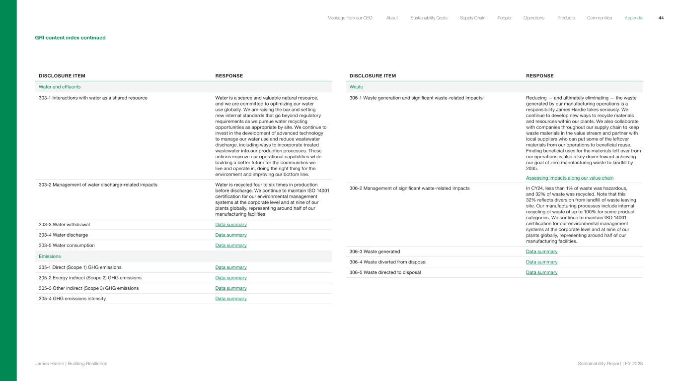 GRI content index continued DISCLOSURE ITEM RESPONSE Water and effluents 303-1 Interactions with water as a shared resource Water is a scarce and valuable natural resource, and we are committed to optimizing our water use globally. We are raising the bar and setting new internal standards that go beyond regulatory requirements as we pursue water recycling opportunities as appropriate by site. We continue to invest in the development of advanced technology to manage our water use and reduce wastewater discharge, including ways to incorporate treated wastewater into our production processes. These actions improve our operational capabilities while building a better future for the communities we live and operate in, doing the right thing for the environment and improving our bottom line. 303-2 Management of water discharge-related impacts Water is recycled four to six times in production before discharge. We continue to maintain ISO 14001 certification for our environmental management systems at the corporate level and at nine of our plants globally, representing around half of our manufacturing facilities. 303-3 Water withdrawal Data summary 303-4 Water discharge Data summary 303-5 Water consumption Data summary Emissions 305-1 Direct (Scope 1) GHG emissions Data summary 305-2 Energy indirect (Scope 2) GHG emissions Data summary 305-3 Other indirect (Scope 3) GHG emissions Data summary 305-4 GHG emissions intensity Data summary DISCLOSURE ITEM RESPONSE Waste 306-1 Waste generation and significant waste-related impacts Reducing — and ultimately eliminating — the waste generated by our manufacturing operations is a responsibility James Hardie takes seriously. We continue to develop new ways to recycle materials and resources within our plants. We also collaborate with companies throughout our supply chain to keep waste materials in the value stream and partner with local suppliers who can put some of the leftover materials from our operations to beneficial reuse. Finding beneficial uses for the materials left over from our operations is also a key driver toward achieving our goal of zero manufacturing waste to landfill by 2035. Assessing impacts along our value chain 306-2 Management of significant waste-related impacts In CY24, less than 1% of waste was hazardous, and 32% of waste was recycled. Note that this 32% reflects diversion from landfill of waste leaving site. Our manufacturing processes include internal recycling of waste of up to 100% for some product categories. We continue to maintain ISO 14001 certification for our environmental management systems at the corporate level and at nine of our plants globally, representing around half of our manufacturing facilities. 306-3 Waste generated Data summary 306-4 Waste diverted from disposal Data summary 306-5 Waste directed to disposal Data summary 44 James Hardie | Building Resilience Sustainability Repor t | FY 2025 About Sustainability Goals Supply Chain OperationsMessage from our CEO People Products Communities Appendix