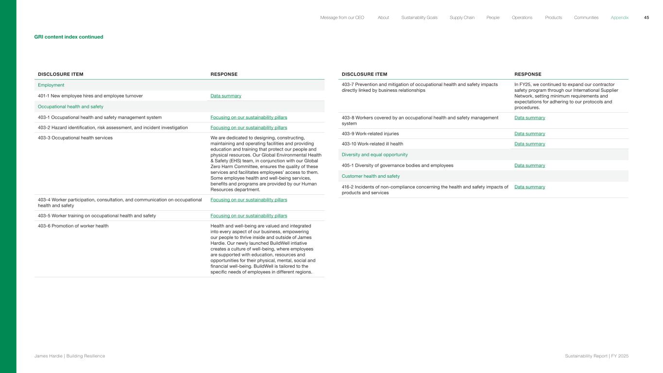 GRI content index continued DISCLOSURE ITEM RESPONSE Employment 401-1 New employee hires and employee turnover Data summary Occupational health and safety 403-1 Occupational health and safety management system Focusing on our sustainability pillars 403-2 Hazard identification, risk assessment, and incident investigation Focusing on our sustainability pillars 403-3 Occupational health services We are dedicated to designing, constructing, maintaining and operating facilities and providing education and training that protect our people and physical resources. Our Global Environmental Health & Safety (EHS) team, in conjunction with our Global Zero Harm Committee, ensures the quality of these services and facilitates employees’ access to them. Some employee health and well-being services, benefits and programs are provided by our Human Resources department.  403-4 Worker participation, consultation, and communication on occupational health and safety Focusing on our sustainability pillars 403-5 Worker training on occupational health and safety Focusing on our sustainability pillars 403-6 Promotion of worker health Health and well-being are valued and integrated into every aspect of our business, empowering our people to thrive inside and outside of James Hardie. Our newly launched BuildWell intiative creates a culture of well-being, where employees are supported with education, resources and opportunities for their physical, mental, social and financial well-being. BuildWell is tailored to the specific needs of employees in different regions. DISCLOSURE ITEM RESPONSE 403-7 Prevention and mitigation of occupational health and safety impacts directly linked by business relationships In FY25, we continued to expand our contractor safety program through our International Supplier Network, setting minimum requirements and expectations for adhering to our protocols and procedures. 403-8 Workers covered by an occupational health and safety management system Data summary 403-9 Work-related injuries Data summary 403-10 Work-related ill health Data summary Diversity and equal opportunity 405-1 Diversity of governance bodies and employees Data summary Customer health and safety 416-2 Incidents of non-compliance concerning the health and safety impacts of products and services Data summary 45 James Hardie | Building Resilience Sustainability Repor t | FY 2025 About Sustainability Goals Supply Chain OperationsMessage from our CEO People Products Communities Appendix