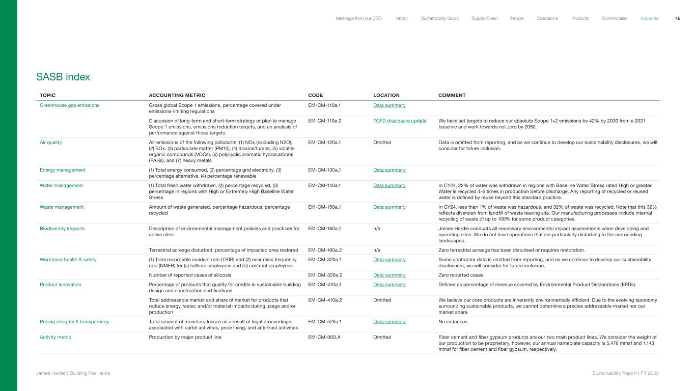 SASB index TOPIC ACCOUNTING METRIC CODE LOCATION COMMENT Greenhouse gas emissions Gross global Scope 1 emissions, percentage covered under emissions-limiting regulations EM-CM-110a.1 Data summary Discussion of long-term and short-term strategy or plan to manage Scope 1 emissions, emissions reduction targets, and an analysis of performance against those targets EM-CM-110a.2 TCFD disclosure update We have set targets to reduce our absolute Scope 1+2 emissions by 42% by 2030 from a 2021 baseline and work towards net zero by 2050. Air quality Air emissions of the following pollutants: (1) NOx (excluding N2O), (2) SOx, (3) particulate matter (PM10), (4) dioxins/furans, (5) volatile organic compounds (VOCs), (6) polycyclic aromatic hydrocarbons (PAHs), and (7) heavy metals EM-CM-120a.1 Omitted Data is omitted from reporting, and as we continue to develop our sustainability disclosures, we will consider for future inclusion. Energy management (1) Total energy consumed, (2) percentage grid electricity, (3) percentage alternative, (4) percentage renewable EM-CM-130a.1 Data summary Water management (1) Total fresh water withdrawn, (2) percentage recycled, (3) percentage in regions with High or Extremely High Baseline Water Stress EM-CM-140a.1 Data summary In CY24, 22% of water was withdrawn in regions with Baseline Water Stress rated High or greater. Water is recycled 4-6 times in production before discharge. Any reporting of recycled or reused water is defined by reuse beyond this standard practice. Waste management Amount of waste generated, percentage hazardous, percentage recycled EM-CM-150a.1 Data summary In CY24, less than 1% of waste was hazardous, and 32% of waste was recycled. Note that this 32% reflects diversion from landfill of waste leaving site. Our manufacturing processes include internal recycling of waste of up to 100% for some product categories. Biodiversity impacts Description of environmental management policies and practices for active sites EM-CM-160a.1 n/a James Hardie conducts all necessary environmental impact assessments when developing and operating sites. We do not have operations that are particularly disturbing to the surrounding landscapes. Terrestrial acreage disturbed, percentage of impacted area restored EM-CM-160a.2 n/a Zero terrestrial acreage has been disturbed or requires restoration. Workforce health & safety (1) Total recordable incident rate (TRIR) and (2) near miss frequency rate (NMFR) for (a) fulltime employees and (b) contract employees EM-CM-320a.1 Data summary Some contractor data is omitted from reporting, and as we continue to develop our sustainability disclosures, we will consider for future inclusion. Number of reported cases of silicosis EM-CM-320a.2 Data summary Zero reported cases. Product innovation Percentage of products that qualify for credits in sustainable building design and construction certifications EM-CM-410a.1 Data summary Defined as percentage of revenue covered by Environmental Product Declarations (EPDs). Total addressable market and share of market for products that reduce energy, water, and/or material impacts during usage and/or production EM-CM-410a.2 Omitted We believe our core products are inherently environmentally efficient. Due to the evolving taxonomy surrounding sustainable products, we cannot determine a precise addressable market nor our market share. Pricing integrity & transparency Total amount of monetary losses as a result of legal proceedings associated with cartel activities, price fixing, and anti-trust activities EM-CM-520a.1 Data summary No instances. Activity metric Production by major product line EM-CM-000.A Omitted Fiber cement and fiber gypsum products are our two main product lines. We consider the weight of our production to be proprietary, however, our annual nameplate capacity is 5,476 mmsf and 1,143 mmsf for fiber cement and fiber gypsum, respectively. 46 James Hardie | Building Resilience Sustainability Repor t | FY 2025 About Sustainability Goals Supply Chain OperationsMessage from our CEO People Products Communities Appendix