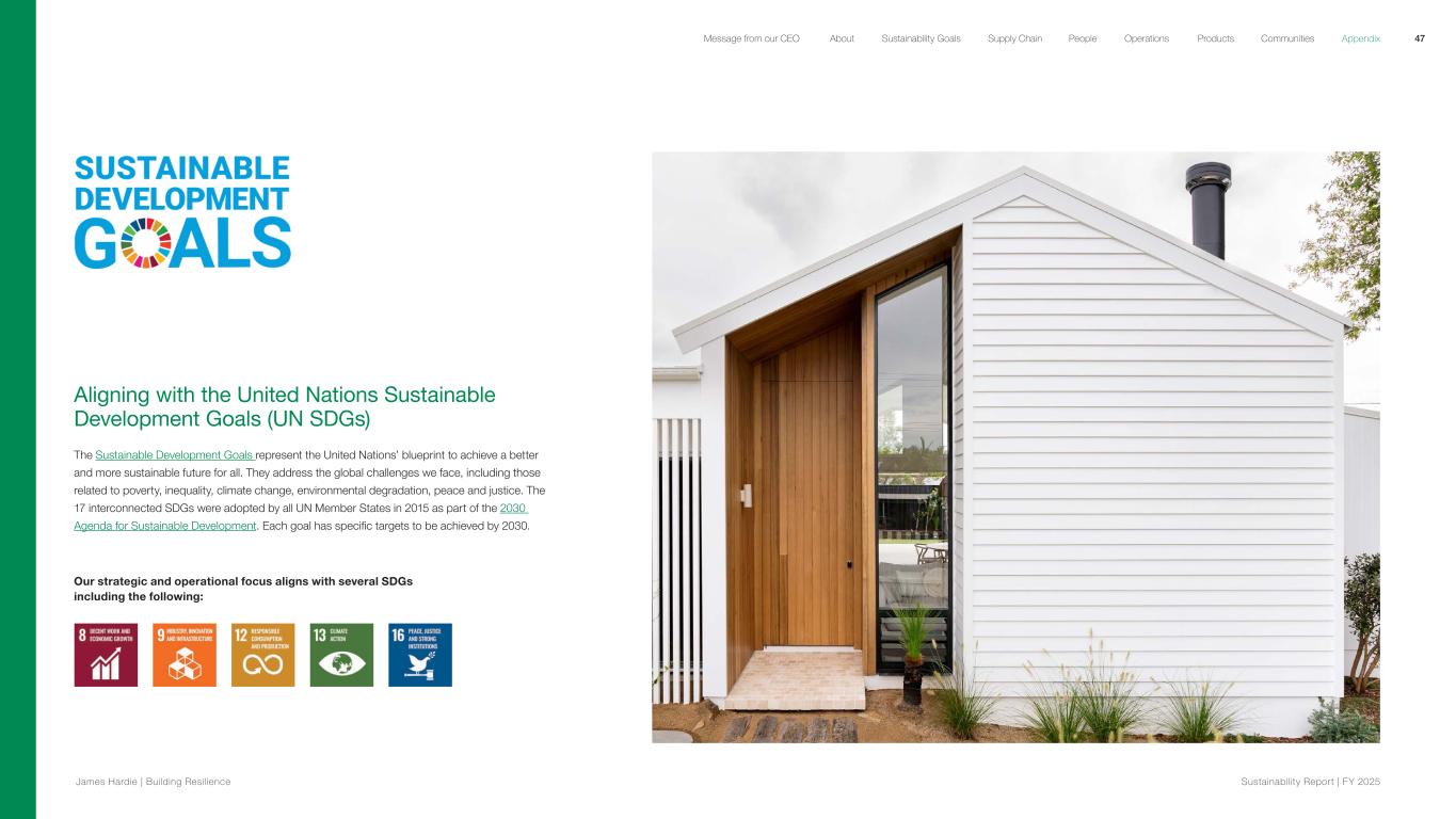 Aligning with the United Nations Sustainable Development Goals (UN SDGs) The Sustainable Development Goals represent the United Nations’ blueprint to achieve a better and more sustainable future for all. They address the global challenges we face, including those related to poverty, inequality, climate change, environmental degradation, peace and justice. The 17 interconnected SDGs were adopted by all UN Member States in 2015 as part of the 2030 Agenda for Sustainable Development. Each goal has specific targets to be achieved by 2030. Our strategic and operational focus aligns with several SDGs including the following: 47 James Hardie | Building Resilience Sustainability Repor t | FY 2025 About Sustainability Goals Supply Chain OperationsMessage from our CEO People Products Communities Appendix