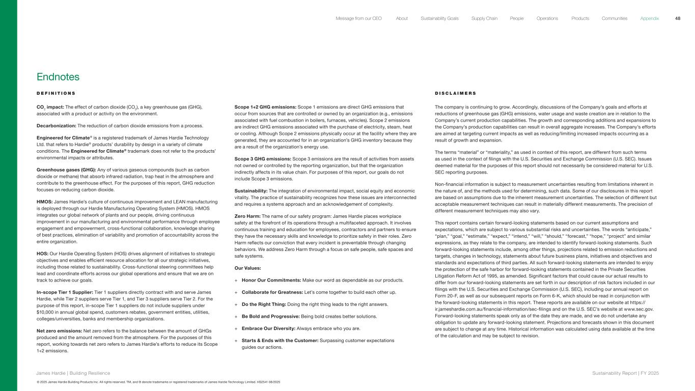 © 2025 James Hardie Building Products Inc. All rights reserved. TM, and ® denote trademarks or registered trademarks of James Hardie Technology Limited. HS2541 08/2025 Endnotes D E F I N I T I O N S CO2 impact: The effect of carbon dioxide (CO2), a key greenhouse gas (GHG), associated with a product or activity on the environment. Decarbonization: The reduction of carbon dioxide emissions from a process. Engineered for Climate® is a registered trademark of James Hardie Technology Ltd. that refers to Hardie® products’ durability by design in a variety of climate conditions. The Engineered for Climate® trademark does not refer to the products’ environmental impacts or attributes. Greenhouse gases (GHG): Any of various gaseous compounds (such as carbon dioxide or methane) that absorb infrared radiation, trap heat in the atmosphere and contribute to the greenhouse effect. For the purposes of this report, GHG reduction focuses on reducing carbon dioxide. HMOS: James Hardie’s culture of continuous improvement and LEAN manufacturing is deployed through our Hardie Manufacturing Operating System (HMOS). HMOS integrates our global network of plants and our people, driving continuous improvement in our manufacturing and environmental performance through employee engagement and empowerment, cross-functional collaboration, knowledge sharing of best practices, elimination of variability and promotion of accountability across the entire organization. HOS: Our Hardie Operating System (HOS) drives alignment of initiatives to strategic objectives and enables efficient resource allocation for all our strategic initiatives, including those related to sustainability. Cross-functional steering committees help lead and coordinate efforts across our global operations and ensure that we are on track to achieve our goals. In-scope Tier 1 Supplier: Tier 1 suppliers directly contract with and serve James Hardie, while Tier 2 suppliers serve Tier 1, and Tier 3 suppliers serve Tier 2. For the purpose of this report, in-scope Tier 1 suppliers do not include suppliers under $10,000 in annual global spend, customers rebates, government entities, utilities, colleges/universities, banks and membership organizations. Net zero emissions: Net zero refers to the balance between the amount of GHGs produced and the amount removed from the atmosphere. For the purposes of this report, working towards net zero refers to James Hardie’s efforts to reduce its Scope 1+2 emissions. Scope 1+2 GHG emissions: Scope 1 emissions are direct GHG emissions that occur from sources that are controlled or owned by an organization (e.g., emissions associated with fuel combustion in boilers, furnaces, vehicles). Scope 2 emissions are indirect GHG emissions associated with the purchase of electricity, steam, heat or cooling. Although Scope 2 emissions physically occur at the facility where they are generated, they are accounted for in an organization’s GHG inventory because they are a result of the organization’s energy use. Scope 3 GHG emissions: Scope 3 emissions are the result of activities from assets not owned or controlled by the reporting organization, but that the organization indirectly affects in its value chain. For purposes of this report, our goals do not include Scope 3 emissions. Sustainability: The integration of environmental impact, social equity and economic vitality. The practice of sustainability recognizes how these issues are interconnected and requires a systems approach and an acknowledgement of complexity. Zero Harm: The name of our safety program: James Hardie places workplace safety at the forefront of its operations through a multifaceted approach. It involves continuous training and education for employees, contractors and partners to ensure they have the necessary skills and knowledge to prioritize safety in their roles. Zero Harm reflects our conviction that every incident is preventable through changing behaviors. We address Zero Harm through a focus on safe people, safe spaces and safe systems. Our Values: + Honor Our Commitments: Make our word as dependable as our products. + Collaborate for Greatness: Let’s come together to build each other up. + Do the Right Thing: Doing the right thing leads to the right answers. + Be Bold and Progressive: Being bold creates better solutions. + Embrace Our Diversity: Always embrace who you are. + Starts & Ends with the Customer: Surpassing customer expectations guides our actions. D I S C L A I M E R S The company is continuing to grow. Accordingly, discussions of the Company’s goals and efforts at reductions of greenhouse gas (GHG) emissions, water usage and waste creation are in relation to the Company’s current production capabilities. The growth and corresponding additions and expansions to the Company’s production capabilities can result in overall aggregate increases. The Company’s efforts are aimed at targeting current impacts as well as reducing/limiting increased impacts occurring as a result of growth and expansion. The terms “material” or “materiality,” as used in context of this report, are different from such terms as used in the context of filings with the U.S. Securities and Exchange Commission (U.S. SEC). Issues deemed material for the purposes of this report should not necessarily be considered material for U.S. SEC reporting purposes. Non-financial information is subject to measurement uncertainties resulting from limitations inherent in the nature of, and the methods used for determining, such data. Some of our disclosures in this report are based on assumptions due to the inherent measurement uncertainties. The selection of different but acceptable measurement techniques can result in materially different measurements. The precision of different measurement techniques may also vary. This report contains certain forward-looking statements based on our current assumptions and expectations, which are subject to various substant