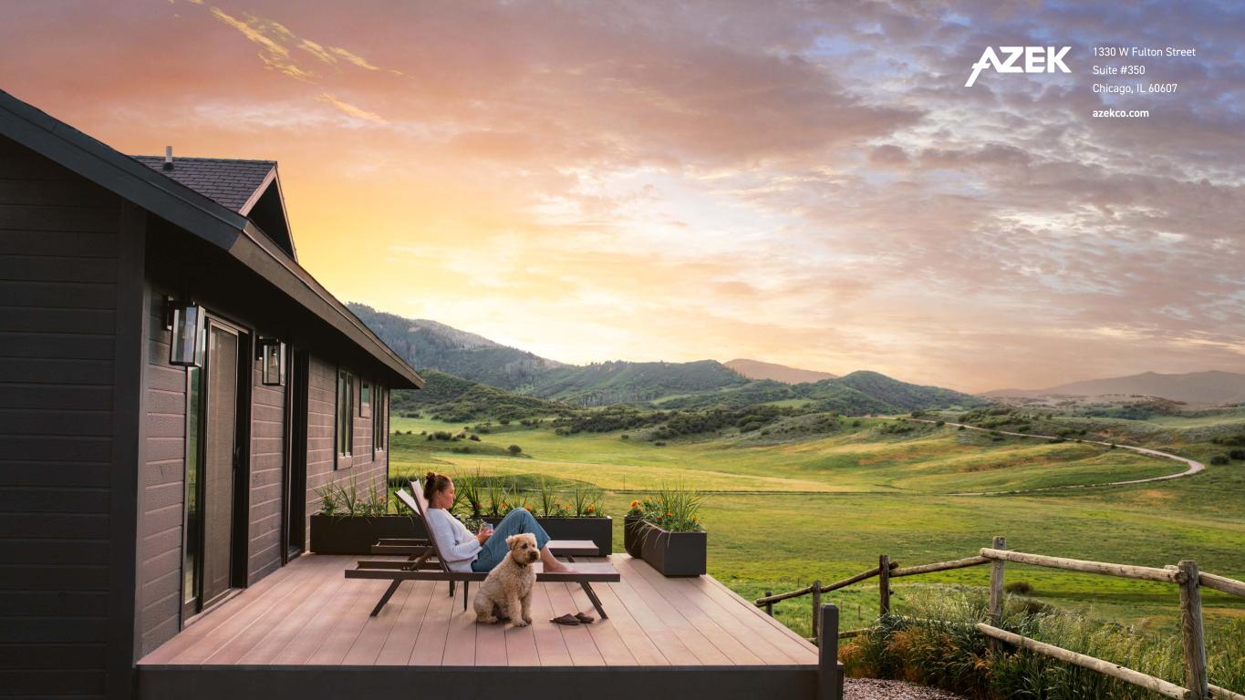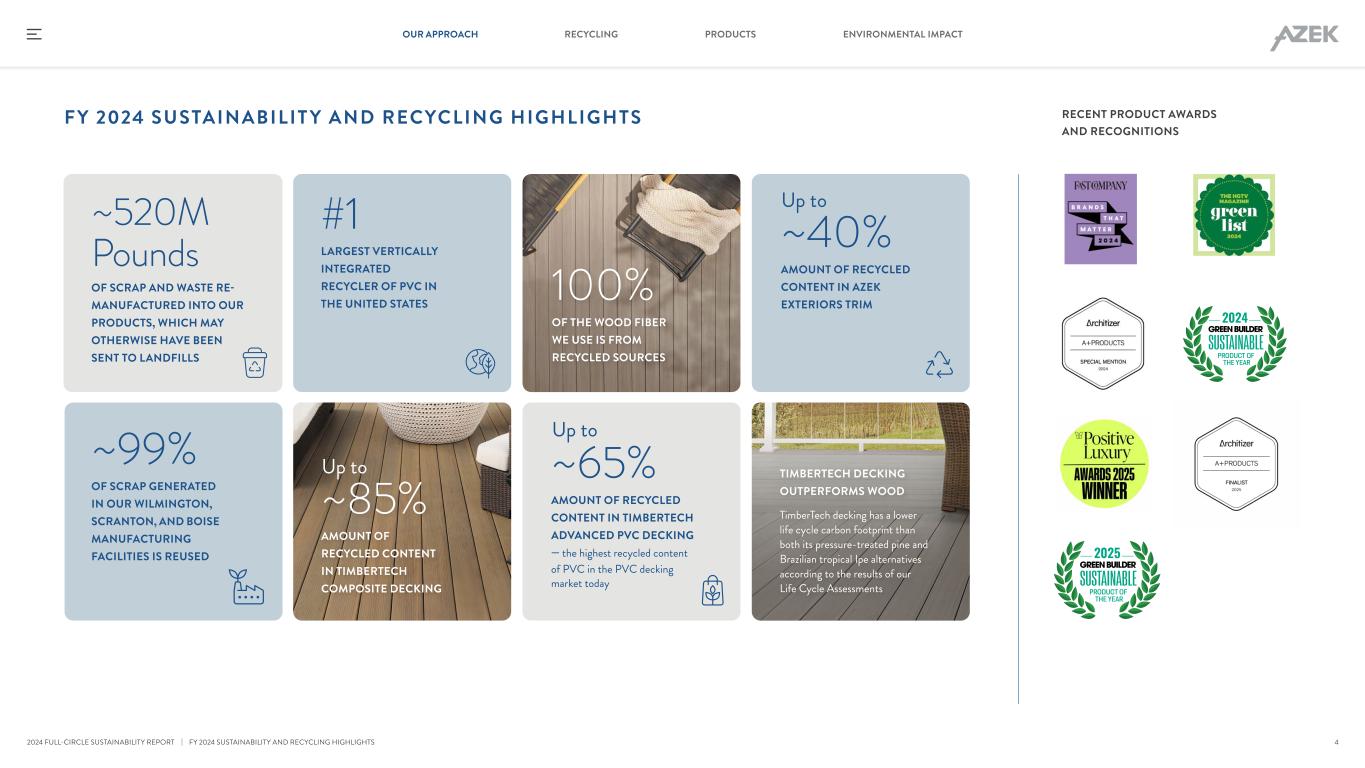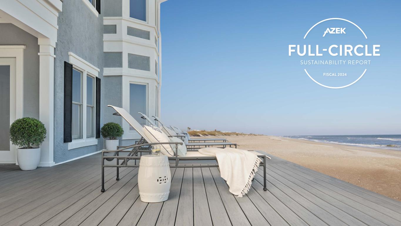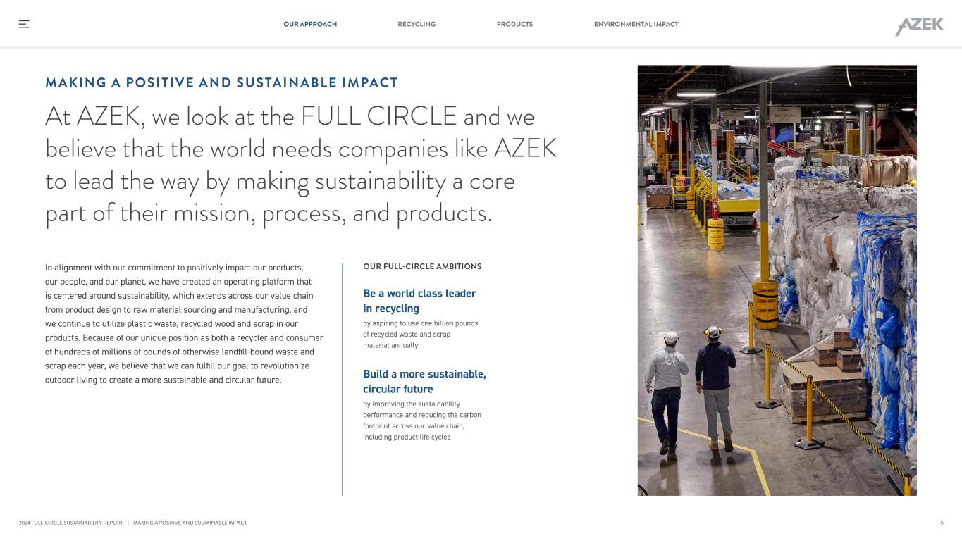 F Y 2024 SUSTAINABILIT Y AND RECYCLING HIGHLIGHTS 100% OF THE WOOD FIBER WE USE IS FROM RECYCLED SOURCES #1 LARGEST VERTICALLY INTEGRATED RECYCLER OF PVC IN THE UNITED STATES RECENT PRODUCT AWARDS AND RECOGNITIONS ~520M Pounds OF SCRAP AND WASTE RE- MANUFACTURED INTO OUR PRODUCTS, WHICH MAY OTHERWISE HAVE BEEN SENT TO LANDFILLS ~85% AMOUNT OF RECYCLED CONTENT IN TIMBERTECH COMPOSITE DECKING ~65% AMOUNT OF RECYCLED CONTENT IN TIMBERTECH ADVANCED PVC DECKING — the highest recycled content of PVC in the PVC decking market today ~99% OF SCRAP GENERATED IN OUR WILMINGTON, SCRANTON, AND BOISE MANUFACTURING FACILITIES IS REUSED ~40% AMOUNT OF RECYCLED CONTENT IN AZEK EXTERIORS TRIM 2024 TIMBERTECH DECKING OUTPERFORMS WOOD TimberTech decking has a lower life cycle carbon footprint than both its pressure-treated pine and Brazilian tropical Ipe alternatives according to the results of our Life Cycle Assessments 2025 Up to Up to Up to 4 RECYCLING PRODUCTS ENVIRONMENTAL IMPACTOUR APPROACH 2024 FULL-CIRCLE SUSTAINABILITY REPORT | FY 2024 SUSTAINABILITY AND RECYCLING HIGHLIGHTS