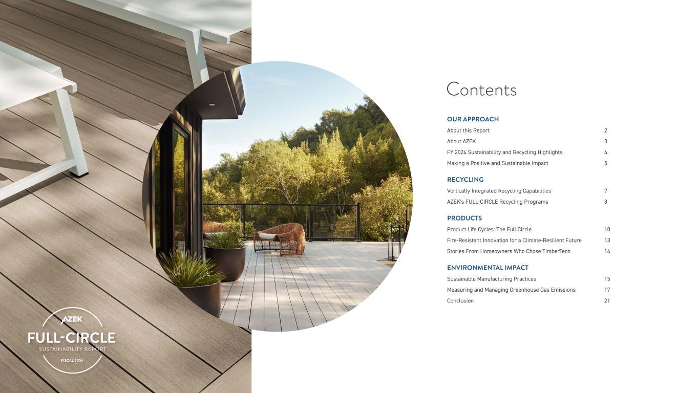 OUR APPROACH About this Report 2 About AZEK 3 FY 2024 Sustainability and Recycling Highlights 4 Making a Positive and Sustainable Impact 5 RECYCLING Vertically Integrated Recycling Capabilities 7 AZEK's FULL-CIRCLE Recycling Programs 8 PRODUCTS Product Life Cycles: The Full Circle 10 Fire-Resistant Innovation for a Climate-Resilient Future 13 Stories From Homeowners Who Chose TimberTech 14 ENVIRONMENTAL IMPACT Sustainable Manufacturing Practices 15 Measuring and Managing Greenhouse Gas Emissions 17 Conclusion 21 Contents