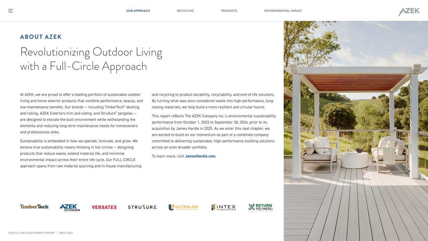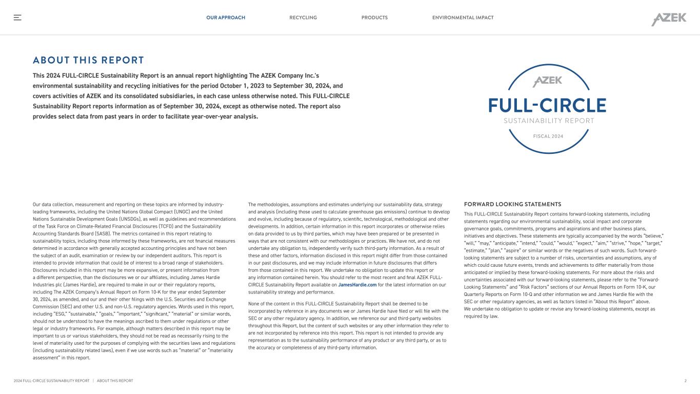 ABOUT THIS REPORT This 2024 FULL-CIRCLE Sustainability Report is an annual report highlighting The AZEK Company Inc.'s environmental sustainability and recycling initiatives for the period October 1, 2023 to September 30, 2024, and covers activities of AZEK and its consolidated subsidiaries, in each case unless otherwise noted. This FULL-CIRCLE Sustainability Report reports information as of September 30, 2024, except as otherwise noted. The report also provides select data from past years in order to facilitate year-over-year analysis. Our data collection, measurement and reporting on these topics are informed by industry- leading frameworks, including the United Nations Global Compact (UNGC) and the United Nations Sustainable Development Goals (UNSDGs), as well as guidelines and recommendations of the Task Force on Climate-Related Financial Disclosures (TCFD) and the Sustainability Accounting Standards Board (SASB). The metrics contained in this report relating to sustainability topics, including those informed by these frameworks, are not financial measures determined in accordance with generally accepted accounting principles and have not been the subject of an audit, examination or review by our independent auditors. This report is intended to provide information that could be of interest to a broad range of stakeholders. Disclosures included in this report may be more expansive, or present information from a different perspective, than the disclosures we or our affiliates, including James Hardie Industries plc (James Hardie), are required to make in our or their regulatory reports, including The AZEK Company’s Annual Report on Form 10-K for the year ended September 30, 2024, as amended, and our and their other filings with the U.S. Securities and Exchange Commission (SEC) and other U.S. and non-U.S. regulatory agencies. Words used in this report, including “ESG,” “sustainable,” “goals,” “important,” “significant,” “material” or similar words, should not be understood to have the meanings ascribed to them under regulations or other legal or industry frameworks. For example, although matters described in this report may be important to us or various stakeholders, they should not be read as necessarily rising to the level of materiality used for the purposes of complying with the securities laws and regulations (including sustainability related laws), even if we use words such as “material” or “materiality assessment” in this report. The methodologies, assumptions and estimates underlying our sustainability data, strategy and analysis (including those used to calculate greenhouse gas emissions) continue to develop and evolve, including because of regulatory, scientific, technological, methodological and other developments. In addition, certain information in this report incorporates or otherwise relies on data provided to us by third parties, which may have been prepared or be presented in ways that are not consistent with our methodologies or practices. We have not, and do not undertake any obligation to, independently verify such third-party information. As a result of these and other factors, information disclosed in this report might differ from those contained in our past disclosures, and we may include information in future disclosures that differs from those contained in this report. We undertake no obligation to update this report or any information contained herein. You should refer to the most recent and final AZEK FULL- CIRCLE Sustainability Report available on JamesHardie.com for the latest information on our sustainability strategy and performance. None of the content in this FULL-CIRCLE Sustainability Report shall be deemed to be incorporated by reference in any documents we or James Hardie have filed or will file with the SEC or any other regulatory agency. In addition, we reference our and third-party websites throughout this Report, but the content of such websites or any other information they refer to are not incorporated by reference into this report. This report is not intended to provide any representation as to the sustainability performance of any product or any third party, or as to the accuracy or completeness of any third-party information. FORWARD LOOKING STATEMENTS This FULL-CIRCLE Sustainability Report contains forward-looking statements, including statements regarding our environmental sustainability, social impact and corporate governance goals, commitments, programs and aspirations and other business plans, initiatives and objectives. These statements are typically accompanied by the words “believe,” “will,” “may,” “anticipate,” “intend,” “could,” “would," “expect,” “aim,” “strive,” “hope,” “target,” “estimate,” “plan,” “aspire” or similar words or the negatives of such words. Such forward- looking statements are subject to a number of risks, uncertainties and assumptions, any of which could cause future events, trends and achievements to differ materially from those anticipated or implied by these forward-looking statements. For more about the risks and uncertainties associated with our forward-looking statements, please refer to the “Forward- Looking Statements” and “Risk Factors” sections of our Annual Reports on Form 10-K, our Quarterly Reports on Form 10-Q and other information we and James Hardie file with the SEC or other regulatory agencies, as well as factors listed in “About this Report” above. We undertake no obligation to update or revise any forward-looking statements, except as required by law. 2 RECYCLING PRODUCTS ENVIRONMENTAL IMPACTOUR APPROACH 2024 FULL-CIRCLE SUSTAINABILITY REPORT | ABOUT THIS REPORT