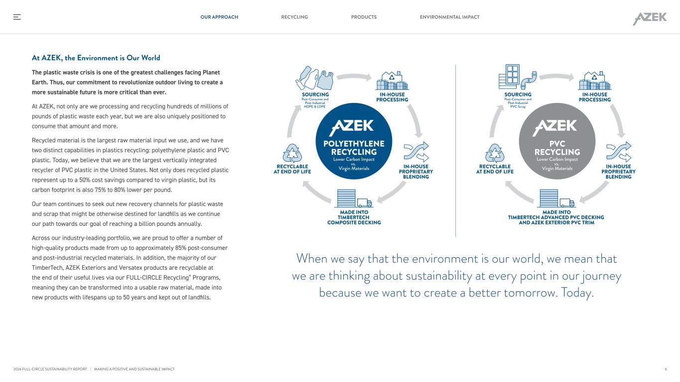 MAKING A POSITIVE AND SUSTAINABLE IMPACT At AZEK, we look at the FULL CIRCLE and we believe that the world needs companies like AZEK to lead the way by making sustainability a core part of their mission, process, and products. In alignment with our commitment to positively impact our products, our people, and our planet, we have created an operating platform that is centered around sustainability, which extends across our value chain from product design to raw material sourcing and manufacturing, and we continue to utilize plastic waste, recycled wood and scrap in our products. Because of our unique position as both a recycler and consumer of hundreds of millions of pounds of otherwise landfill-bound waste and scrap each year, we believe that we can fulfill our goal to revolutionize outdoor living to create a more sustainable and circular future. OUR FULL-CIRCLE AMBITIONS Be a world class leader in recycling by aspiring to use one billion pounds of recycled waste and scrap material annually Build a more sustainable, circular future by improving the sustainability performance and reducing the carbon footprint across our value chain, including product life cycles | MAKING A POSITIVE AND SUSTAINABLE IMPACT 5 RECYCLING PRODUCTS ENVIRONMENTAL IMPACTOUR APPROACH 2024 FULL-CIRCLE SUSTAINABILITY REPORT
