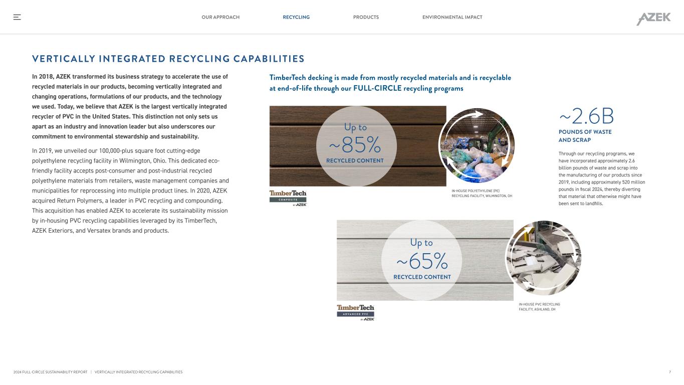 At AZEK, the Environment is Our World The plastic waste crisis is one of the greatest challenges facing Planet Earth. Thus, our commitment to revolutionize outdoor living to create a more sustainable future is more critical than ever. At AZEK, not only are we processing and recycling hundreds of millions of pounds of plastic waste each year, but we are also uniquely positioned to consume that amount and more. Recycled material is the largest raw material input we use, and we have two distinct capabilities in plastics recycling: polyethylene plastic and PVC plastic. Today, we believe that we are the largest vertically integrated recycler of PVC plastic in the United States. Not only does recycled plastic represent up to a 50% cost savings compared to virgin plastic, but its carbon footprint is also 75% to 80% lower per pound. Our team continues to seek out new recovery channels for plastic waste and scrap that might be otherwise destined for landfills as we continue our path towards our goal of reaching a billion pounds annually. Across our industry-leading portfolio, we are proud to offer a number of high-quality products made from up to approximately 85% post-consumer and post-industrial recycled materials. In addition, the majority of our TimberTech, AZEK Exteriors and Versatex products are recyclable at the end of their useful lives via our FULL-CIRCLE Recycling® Programs, meaning they can be transformed into a usable raw material, made into new products with lifespans up to 50 years and kept out of landfills. SOURCING IN-HOUSE PROPRIETARY BLENDING IN-HOUSE PROCESSING MADE INTO TIMBERTECH COMPOSITE DECKING POLYETHYLENE RECYCLING Lower Carbon Impact vs. Virgin Materials Post-Consumer and Post-Industrial HDPE & LDPE Post-Consumer and Post-Industrial PVC Scrap Lower Carbon Impact vs. Virgin MaterialsRECYCLABLE AT END OF LIFE SOURCING IN-HOUSE PROPRIETARY BLENDING IN-HOUSE PROCESSING MADE INTO TIMBERTECH ADVANCED PVC DECKING AND AZEK EXTERIOR PVC TRIM PVC RECYCLING RECYCLABLE AT END OF LIFE SOURCING IN-HOUSE PROPRIETARY BLENDING IN-HOUSE PROCESSING MADE INTO TIMBERTECH COMPOSITE DECKING PO YETHYLENE RECYCLING Lower Carbon Impact vs. Virgin Materials Post-Consumer and Post-Industrial HDPE & LDPE Post-Consumer and Post-Industrial PVC Scrap Lower Carbon Impact vs. Virgin MaterialsRECYCLABLE AT ND OF LIFE SOURCING IN-HOUSE PROPRIETARY BLENDING IN-HOUSE PROCESSING MADE INTO TIMBERTECH ADVANCED PVC DECKING AND AZEK EXTE OR PVC TRIM PVC RECYCLING RECYCLABLE AT ND OF LIFE When we say that the environment is our world, we mean that we are thinking about sustainability at every point in our journey because we want to create a better tomorrow. Today. | MAKING A POSITIVE AND SUSTAINABLE IMPACT 6 RECYCLING PRODUCTS ENVIRONMENTAL IMPACTOUR APPROACH 2024 FULL-CIRCLE SUSTAINABILITY REPORT