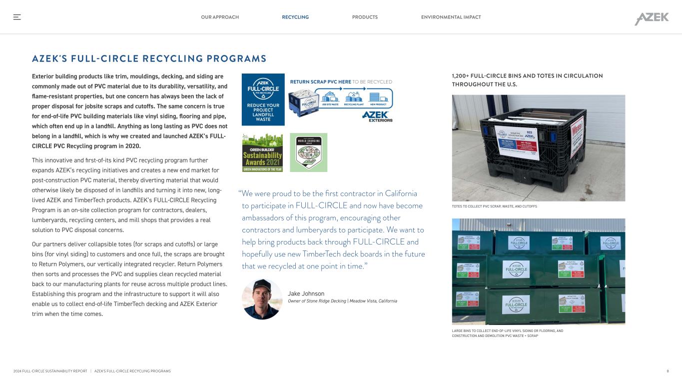 Exterior building products like trim, mouldings, decking, and siding are commonly made out of PVC material due to its durability, versatility, and flame-resistant properties, but one concern has always been the lack of proper disposal for jobsite scraps and cutoffs. The same concern is true for end-of-life PVC building materials like vinyl siding, flooring and pipe, which often end up in a landfill. Anything as long lasting as PVC does not belong in a landfill, which is why we created and launched AZEK’s FULL- CIRCLE PVC Recycling program in 2020. This innovative and first-of-its kind PVC recycling program further expands AZEK’s recycling initiatives and creates a new end market for post-construction PVC material, thereby diverting material that would otherwise likely be disposed of in landfills and turning it into new, long- lived AZEK and TimberTech products. AZEK’s FULL-CIRCLE Recycling Program is an on-site collection program for contractors, dealers, lumberyards, recycling centers, and mill shops that provides a real solution to PVC disposal concerns. Our partners deliver collapsible totes (for scraps and cutoffs) or large bins (for vinyl siding) to customers and once full, the scraps are brought to Return Polymers, our vertically integrated recycler. Return Polymers then sorts and processes the PVC and supplies clean recycled material back to our manufacturing plants for reuse across multiple product lines. Establishing this program and the infrastructure to support it will also enable us to collect end-of-life TimberTech decking and AZEK Exterior trim when the time comes. AZEK'S FULL-CIRCLE RECYCLING PROGRAMS TOTES TO COLLECT PVC SCRAP, WASTE, AND CUTOFFS 1,200+ FULL-CIRCLE BINS AND TOTES IN CIRCULATION THROUGHOUT THE U.S. LARGE BINS TO COLLECT END-OF-LIFE VINYL SIDING OR FLOORING, AND CONSTRUCTION AND DEMOLITION PVC WASTE + SCRAP | AZEK'S FULL-CIRCLE RECYCLING PROGRAMS “We were proud to be the first contractor in California to participate in FULL-CIRCLE and now have become ambassadors of this program, encouraging other contractors and lumberyards to participate. We want to help bring products back through FULL-CIRCLE and hopefully use new TimberTech deck boards in the future that we recycled at one point in time.” Jake Johnson Owner of Stone Ridge Decking | Meadow Vista, California 8 RECYCLING PRODUCTS ENVIRONMENTAL IMPACTOUR APPROACH 2024 FULL-CIRCLE SUSTAINABILITY REPORT