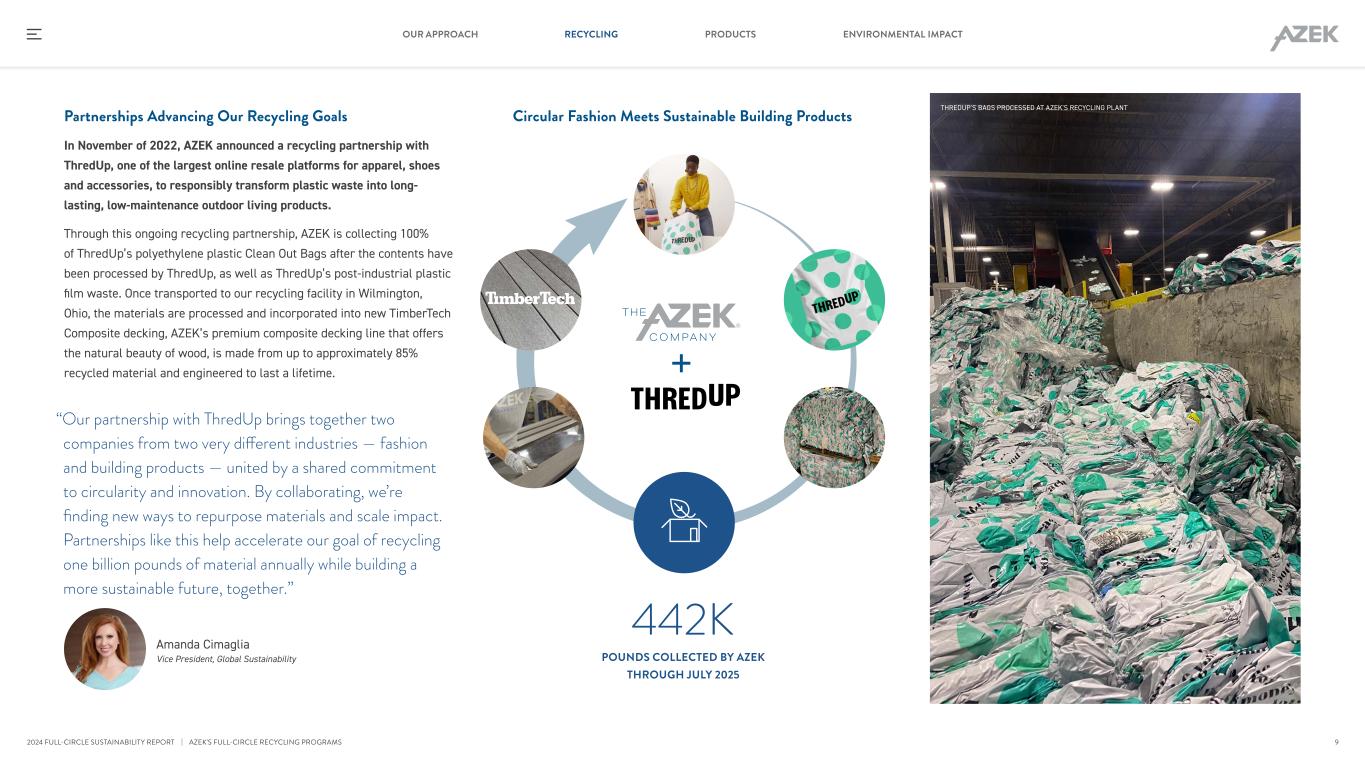 Partnerships Advancing Our Recycling Goals In November of 2022, AZEK announced a recycling partnership with ThredUp, one of the largest online resale platforms for apparel, shoes and accessories, to responsibly transform plastic waste into long- lasting, low-maintenance outdoor living products. Through this ongoing recycling partnership, AZEK is collecting 100% of ThredUp’s polyethylene plastic Clean Out Bags after the contents have been processed by ThredUp, as well as ThredUp’s post-industrial plastic film waste. Once transported to our recycling facility in Wilmington, Ohio, the materials are processed and incorporated into new TimberTech Composite decking, AZEK’s premium composite decking line that offers the natural beauty of wood, is made from up to approximately 85% recycled material and engineered to last a lifetime. Circular Fashion Meets Sustainable Building Products “Our partnership with ThredUp brings together two companies from two very different industries — fashion and building products — united by a shared commitment to circularity and innovation. By collaborating, we’re finding new ways to repurpose materials and scale impact. Partnerships like this help accelerate our goal of recycling one billion pounds of material annually while building a more sustainable future, together.” Amanda Cimaglia Vice President, Global Sustainability THREDUP'S BAGS PROCESSED AT AZEK'S RECYCLING PLANT 442K POUNDS COLLECTED BY AZEK THROUGH JULY 2025 | AZEK'S FULL-CIRCLE RECYCLING PROGRAMS 9 RECYCLING PRODUCTS ENVIRONMENTAL IMPACTOUR APPROACH 2024 FULL-CIRCLE SUSTAINABILITY REPORT