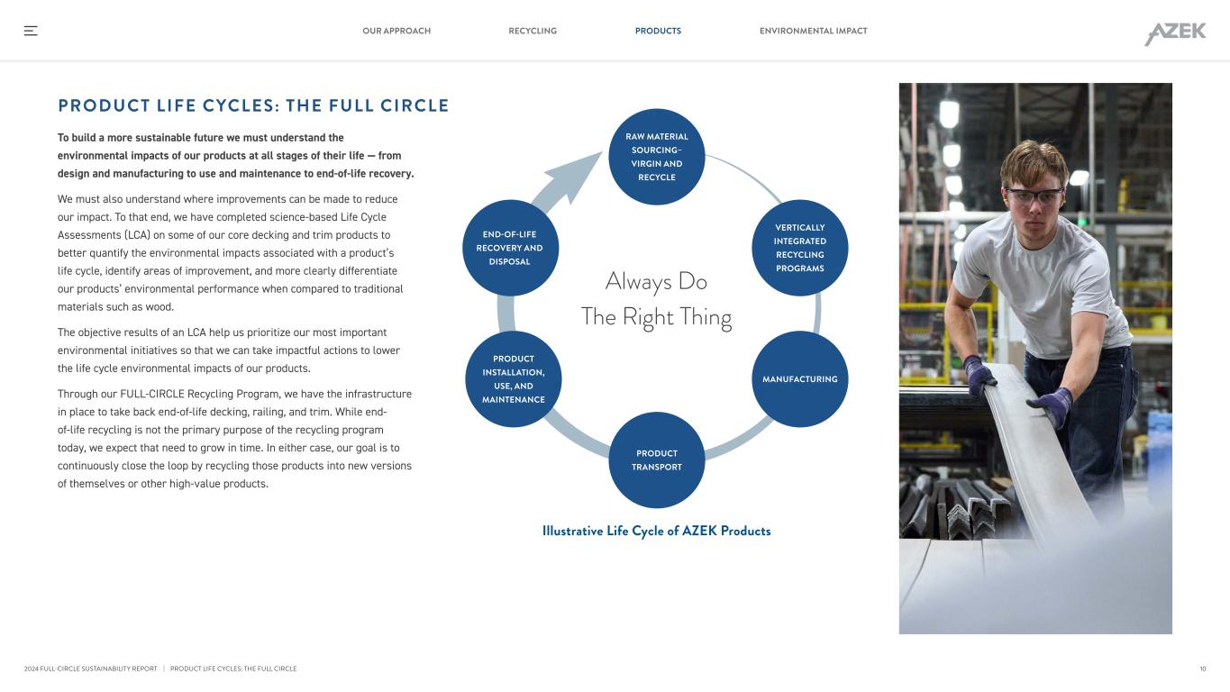 PRODUCT LIFE CYCLES: THE FULL CIRCLE To build a more sustainable future we must understand the environmental impacts of our products at all stages of their life — from design and manufacturing to use and maintenance to end-of-life recovery. We must also understand where improvements can be made to reduce our impact. To that end, we have completed science-based Life Cycle Assessments (LCA) on some of our core decking and trim products to better quantify the environmental impacts associated with a product’s life cycle, identify areas of improvement, and more clearly differentiate our products’ environmental performance when compared to traditional materials such as wood. The objective results of an LCA help us prioritize our most important environmental initiatives so that we can take impactful actions to lower the life cycle environmental impacts of our products. Through our FULL-CIRCLE Recycling Program, we have the infrastructure in place to take back end-of-life decking, railing, and trim. While end- of-life recycling is not the primary purpose of the recycling program today, we expect that need to grow in time. In either case, our goal is to continuously close the loop by recycling those products into new versions of themselves or other high-value products. RAW MATERIAL SOURCING– VIRGIN AND RECYCLE END-OF-LIFE RECOVERY AND DISPOSAL VERTICALLY INTEGRATED RECYCLING PROGRAMS PRODUCT INSTALLATION, USE, AND MAINTENANCE MANUFACTURING PRODUCT TRANSPORT Always Do The Right Thing Illustrative Life Cycle of AZEK Products | PRODUCT LIFE CYCLES: THE FULL CIRCLE 10 RECYCLING PRODUCTS ENVIRONMENTAL IMPACTOUR APPROACH 2024 FULL-CIRCLE SUSTAINABILITY REPORT