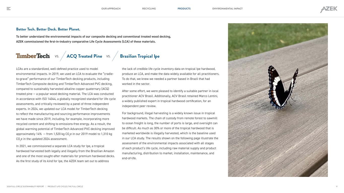 Better Tech. Better Deck. Better Planet. To better understand the environmental impacts of our composite decking and conventional treated wood decking, AZEK commissioned the first-in-industry comparative Life Cycle Assessments (LCA) of these materials. Brazilian Tropical IpeACQ Treated PineVS. VS. LCAs are a standardized, well-defined practice used to model environmental impacts. In 2019, we used an LCA to evaluate the “cradle- to-grave” performance of our TimberTech decking products, including TimberTech Composite decking and TimberTech Advanced PVC decking, compared to sustainably harvested alkaline copper quaternary (ACQ) treated pine — a popular wood decking material. The LCA was conducted in accordance with ISO 14044, a globally recognized standard for life cycle assessments, and critically reviewed by a panel of three independent experts. In 2024, we updated our LCA model for TimberTech decking to reflect the manufacturing and sourcing performance improvements we have made since 2019, including, for example, incorporating more recycled content and shifting to emissions-free energy. As a result, the global warming potential of TimberTech Advanced PVC decking improved approximately 14% — from 1,520 kg CO2e in our 2019 model to 1,310 kg CO2e in the updated 2024 assessment. In 2021, we commissioned a separate LCA study for Ipe, a tropical hardwood harvested both legally and illegally from the Brazilian Amazon and one of the most sought-after materials for premium hardwood decks. As the first study of its kind for Ipe, the AZEK team set out to address the lack of credible life cycle inventory data on tropical Ipe hardwood, produce an LCA, and make the data widely available for all practitioners. To do that, we knew we needed a partner based in Brazil that had worked in the sector. After some effort, we were pleased to identify a suitable partner in local practitioner ACV Brasil. Additionally, ACV Brasil retained Marco Lentini, a widely published expert in tropical hardwood certification, for an independent peer review. For background, illegal harvesting is a widely known issue in tropical hardwood markets. The chain of custody from remote forest to sawmill to ocean freight is long, the number of ports is large, and oversight can be difficult. As much as 30% or more of the tropical hardwood that is marketed worldwide is illegally harvested, which is the baseline used in our LCA study. The results shown on the following page illustrate the assessment of the environmental impacts associated with all stages of each product’s life cycle, including raw material supply and product manufacturing, distribution to market, installation, maintenance, and end-of-life. | PRODUCT LIFE CYCLES: THE FULL CIRCLE 11 RECYCLING PRODUCTS ENVIRONMENTAL IMPACTOUR APPROACH 2024 FULL-CIRCLE SUSTAINABILITY REPORT