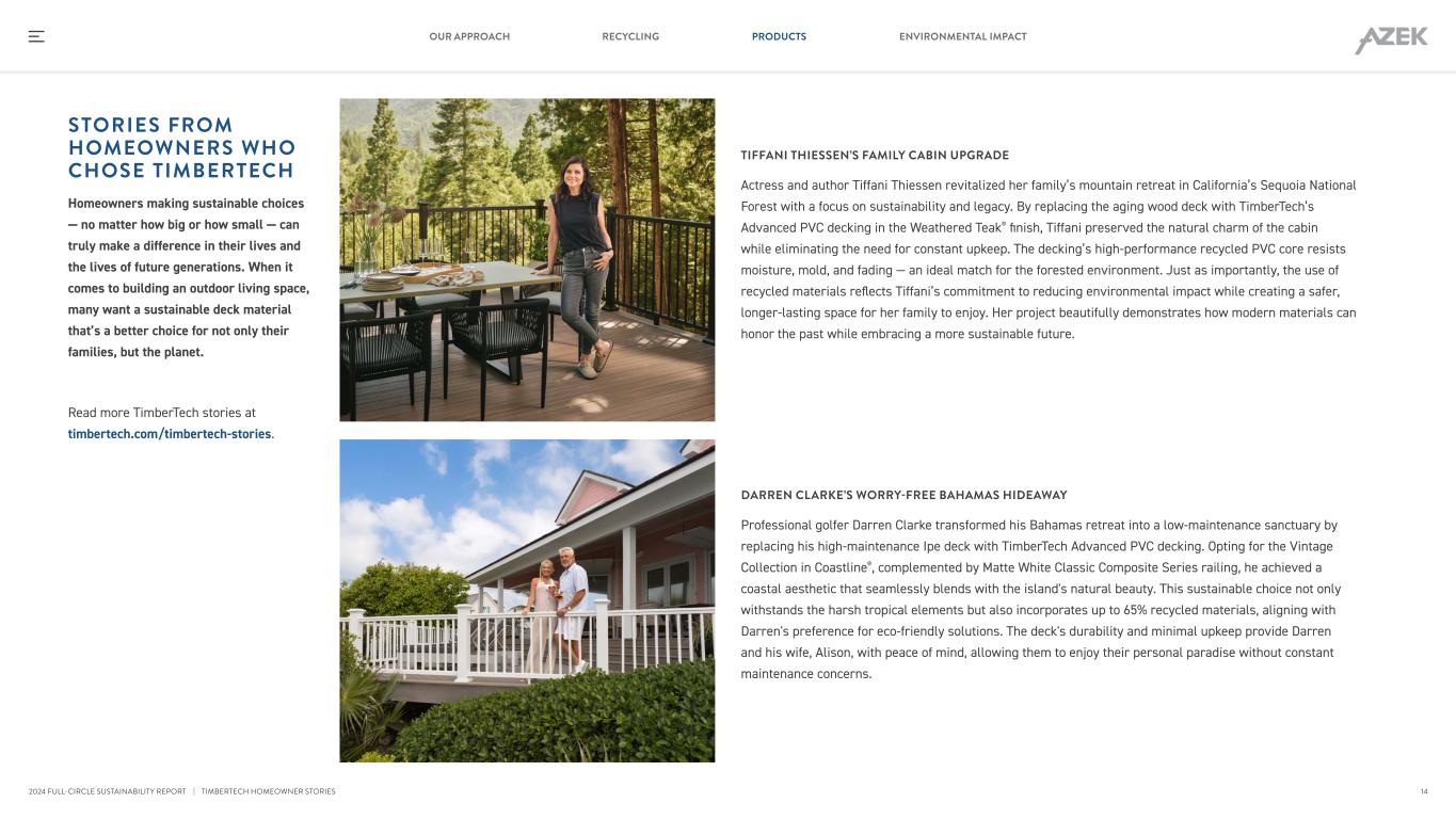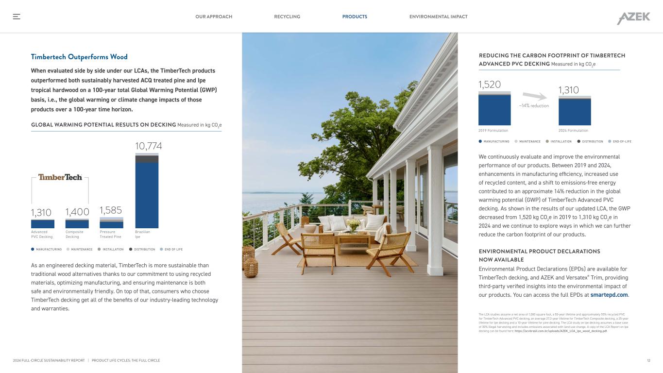 Timbertech Outperforms Wood When evaluated side by side under our LCAs, the TimberTech products outperformed both sustainably harvested ACQ treated pine and Ipe tropical hardwood on a 100-year total Global Warming Potential (GWP) basis, i.e., the global warming or climate change impacts of those products over a 100-year time horizon. We continuously evaluate and improve the environmental performance of our products. Between 2019 and 2024, enhancements in manufacturing efficiency, increased use of recycled content, and a shift to emissions-free energy contributed to an approximate 14% reduction in the global warming potential (GWP) of TimberTech Advanced PVC decking. As shown in the results of our updated LCA, the GWP decreased from 1,520 kg CO2e in 2019 to 1,310 kg CO2e in 2024 and we continue to explore ways in which we can further reduce the carbon footprint of our products. ENVIRONMENTAL PRODUCT DECLARATIONS NOW AVAILABLE Environmental Product Declarations (EPDs) are available for TimberTech decking, and AZEK and Versatex® Trim, providing third-party verified insights into the environmental impact of our products. You can access the full EPDs at smartepd.com. The LCA studies assume a net area of 1,000 square foot, a 50-year lifetime and approximately 55% recycled PVC for TimberTech Advanced PVC decking, an average 27.3-year lifetime for TimberTech Composite decking, a 25-year lifetime for Ipe decking and a 10-year lifetime for pine decking. The LCA study on Ipe decking assumes a base case of 30% illegal harvesting and includes emissions associated with land-use change. A copy of the LCA Report on Ipe decking can be found here: https://acvbrasil.com.br/uploads/AZEK_LCA_ipe_wood_decking.pdf. | PRODUCT LIFE CYCLES: THE FULL CIRCLE REDUCING THE CARBON FOOTPRINT OF TIMBERTECH ADVANCED PVC DECKING Measured in kg CO2e As an engineered decking material, TimberTech is more sustainable than traditional wood alternatives thanks to our commitment to using recycled materials, optimizing manufacturing, and ensuring maintenance is both safe and environmentally friendly. On top of that, consumers who choose TimberTech decking get all of the benefits of our industry-leading technology and warranties. GLOBAL WARMING POTENTIAL RESULTS ON DECKING Measured in kg CO2e Advanced PVC Decking 1,310 Composite Decking 1,400 Pressure Treated Pine 1,585 Brazilian Ipe 10,774 END OF LIFEDISTRIBUTIONINSTALLATIONMAINTENANCEMANUFACTURING END-OF-LIFEDISTRIBUTIONINSTALLATIONMAINTENANCEMANUFACTURING 2019 Formulation 1,520 1,310 2024 Formulation ~14% reduction 12 RECYCLING PRODUCTS ENVIRONMENTAL IMPACTOUR APPROACH 2024 FULL-CIRCLE SUSTAINABILITY REPORT