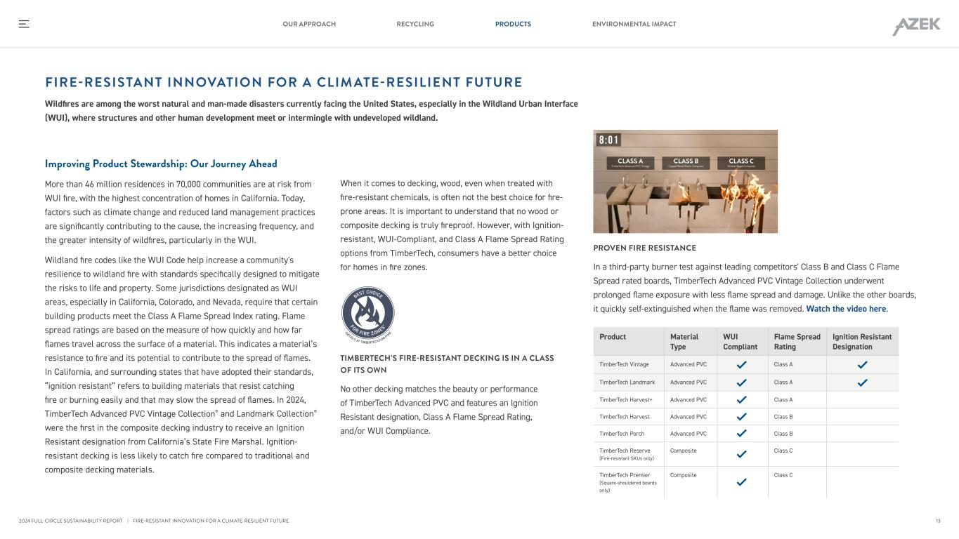 Improving Product Stewardship: Our Journey Ahead More than 46 million residences in 70,000 communities are at risk from WUI fire, with the highest concentration of homes in California. Today, factors such as climate change and reduced land management practices are significantly contributing to the cause, the increasing frequency, and the greater intensity of wildfires, particularly in the WUI. Wildland fire codes like the WUI Code help increase a community's resilience to wildland fire with standards specifically designed to mitigate the risks to life and property. Some jurisdictions designated as WUI areas, especially in California, Colorado, and Nevada, require that certain building products meet the Class A Flame Spread Index rating. Flame spread ratings are based on the measure of how quickly and how far flames travel across the surface of a material. This indicates a material’s resistance to fire and its potential to contribute to the spread of flames. In California, and surrounding states that have adopted their standards, “ignition resistant” refers to building materials that resist catching fire or burning easily and that may slow the spread of flames. In 2024, TimberTech Advanced PVC Vintage Collection® and Landmark Collection® were the first in the composite decking industry to receive an Ignition Resistant designation from California’s State Fire Marshal. Ignition- resistant decking is less likely to catch fire compared to traditional and composite decking materials. FIRE-RESISTANT INNOVATION FOR A CLIM ATE-RESILIENT FUTURE Wildfires are among the worst natural and man-made disasters currently facing the United States, especially in the Wildland Urban Interface (WUI), where structures and other human development meet or intermingle with undeveloped wildland. When it comes to decking, wood, even when treated with fire-resistant chemicals, is often not the best choice for fire- prone areas. It is important to understand that no wood or composite decking is truly fireproof. However, with Ignition- resistant, WUI-Compliant, and Class A Flame Spread Rating options from TimberTech, consumers have a better choice for homes in fire zones. TIMBERTECH'S FIRE-RESISTANT DECKING IS IN A CLASS OF ITS OWN No other decking matches the beauty or performance of TimberTech Advanced PVC and features an Ignition Resistant designation, Class A Flame Spread Rating, and/or WUI Compliance. BEST CHOICE FOR FIRE ZONES * *DETAILS AT TIMBERTECH.COM/FIR E | FIRE-RESISTANT INNOVATION FOR A CLIMATE-RESILIENT FUTURE PROVEN FIRE RESISTANCE In a third-party burner test against leading competitors' Class B and Class C Flame Spread rated boards, TimberTech Advanced PVC Vintage Collection underwent prolonged flame exposure with less flame spread and damage. Unlike the other boards, it quickly self-extinguished when the flame was removed. Watch the video here. Product Material Type WUI Compliant Flame Spread Rating Ignition Resistant Designation TimberTech Vintage Advanced PVC Class A TimberTech Landmark Advanced PVC Class A TimberTech Harvest+ Advanced PVC Class A TimberTech Harvest Advanced PVC Class B TimberTech Porch Advanced PVC Class B TimberTech Reserve (Fire-resistant SKUs only) Composite Class C TimberTech Premier (Square-shouldered boards only) Composite Class C 13 RECYCLING PRODUCTS ENVIRONMENTAL IMPACTOUR APPROACH 2024 FULL-CIRCLE SUSTAINABILITY REPORT