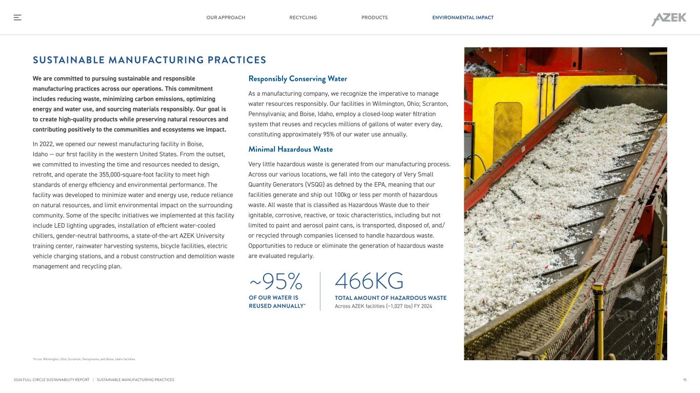 We are committed to pursuing sustainable and responsible manufacturing practices across our operations. This commitment includes reducing waste, minimizing carbon emissions, optimizing energy and water use, and sourcing materials responsibly. Our goal is to create high-quality products while preserving natural resources and contributing positively to the communities and ecosystems we impact. In 2022, we opened our newest manufacturing facility in Boise, Idaho — our first facility in the western United States. From the outset, we committed to investing the time and resources needed to design, retrofit, and operate the 355,000-square-foot facility to meet high standards of energy efficiency and environmental performance. The facility was developed to minimize water and energy use, reduce reliance on natural resources, and limit environmental impact on the surrounding community. Some of the specific initiatives we implemented at this facility include LED lighting upgrades, installation of efficient water-cooled chillers, gender-neutral bathrooms, a state-of-the-art AZEK University training center, rainwater harvesting systems, bicycle facilities, electric vehicle charging stations, and a robust construction and demolition waste management and recycling plan. SUSTAINABLE M ANUFAC TURING PRAC TICES Responsibly Conserving Water As a manufacturing company, we recognize the imperative to manage water resources responsibly. Our facilities in Wilmington, Ohio; Scranton, Pennsylvania; and Boise, Idaho, employ a closed-loop water filtration system that reuses and recycles millions of gallons of water every day, constituting approximately 95% of our water use annually. Minimal Hazardous Waste Very little hazardous waste is generated from our manufacturing process. Across our various locations, we fall into the category of Very Small Quantity Generators (VSQG) as defined by the EPA, meaning that our facilities generate and ship out 100kg or less per month of hazardous waste. All waste that is classified as Hazardous Waste due to their ignitable, corrosive, reactive, or toxic characteristics, including but not limited to paint and aerosol paint cans, is transported, disposed of, and/ or recycled through companies licensed to handle hazardous waste. Opportunities to reduce or eliminate the generation of hazardous waste are evaluated regularly. *In our Wilmington, Ohio; Scranton, Pensylvania; and Boise, Idaho facilities ~95% OF OUR WATER IS REUSED ANNUALLY* 466KG TOTAL AMOUNT OF HAZARDOUS WASTE Across AZEK facilities (~1,027 lbs) FY 2024 | SUSTAINABLE MANUFACTURING PRACTICES 15 RECYCLING PRODUCTS ENVIRONMENTAL IMPACTOUR APPROACH 2024 FULL-CIRCLE SUSTAINABILITY REPORT