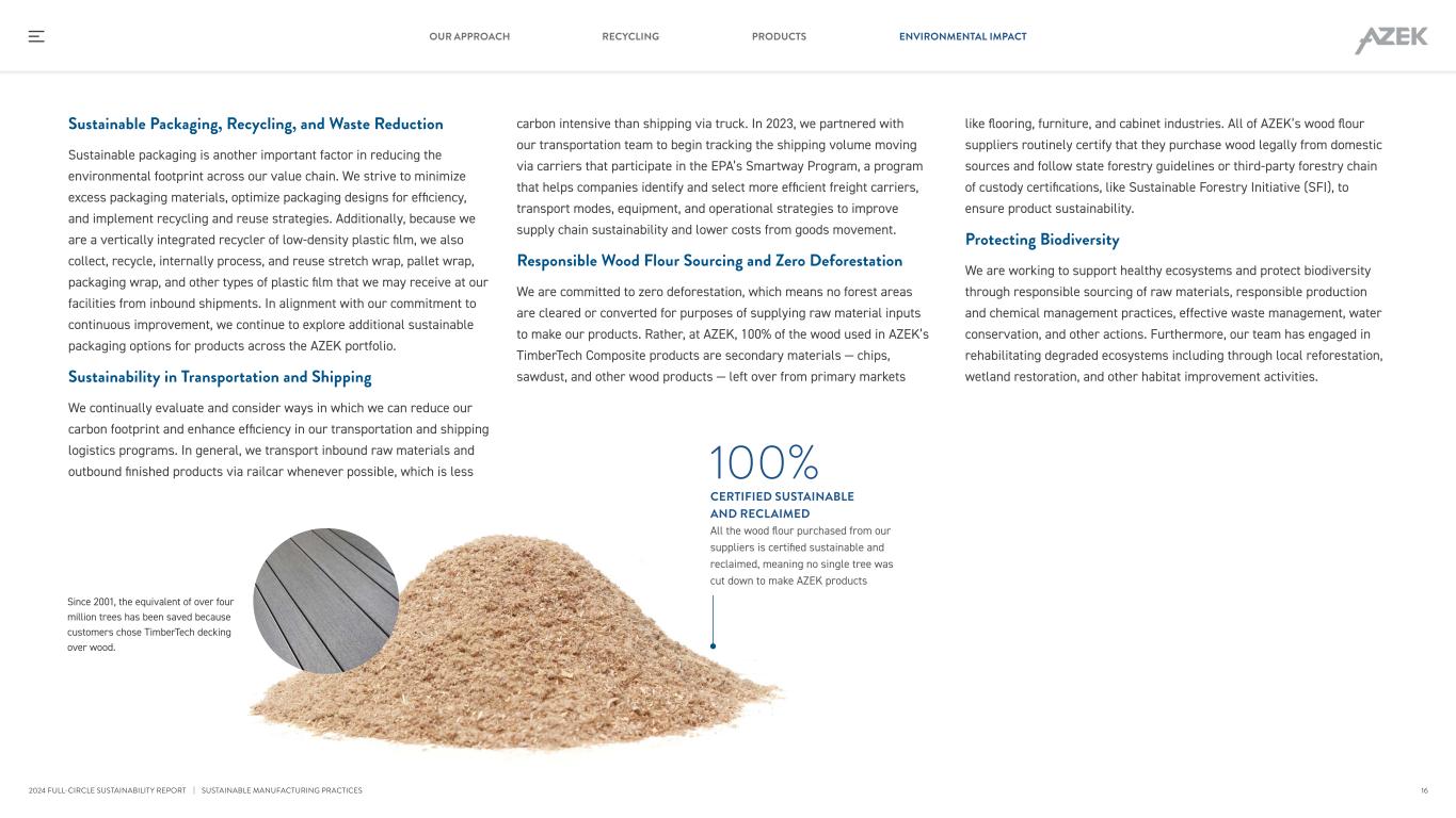 Sustainable Packaging, Recycling, and Waste Reduction Sustainable packaging is another important factor in reducing the environmental footprint across our value chain. We strive to minimize excess packaging materials, optimize packaging designs for efficiency, and implement recycling and reuse strategies. Additionally, because we are a vertically integrated recycler of low-density plastic film, we also collect, recycle, internally process, and reuse stretch wrap, pallet wrap, packaging wrap, and other types of plastic film that we may receive at our facilities from inbound shipments. In alignment with our commitment to continuous improvement, we continue to explore additional sustainable packaging options for products across the AZEK portfolio. Sustainability in Transportation and Shipping We continually evaluate and consider ways in which we can reduce our carbon footprint and enhance efficiency in our transportation and shipping logistics programs. In general, we transport inbound raw materials and outbound finished products via railcar whenever possible, which is less carbon intensive than shipping via truck. In 2023, we partnered with our transportation team to begin tracking the shipping volume moving via carriers that participate in the EPA’s Smartway Program, a program that helps companies identify and select more efficient freight carriers, transport modes, equipment, and operational strategies to improve supply chain sustainability and lower costs from goods movement. Responsible Wood Flour Sourcing and Zero Deforestation We are committed to zero deforestation, which means no forest areas are cleared or converted for purposes of supplying raw material inputs to make our products. Rather, at AZEK, 100% of the wood used in AZEK’s TimberTech Composite products are secondary materials — chips, sawdust, and other wood products — left over from primary markets Since 2001, the equivalent of over four million trees has been saved because customers chose TimberTech decking over wood. like flooring, furniture, and cabinet industries. All of AZEK’s wood flour suppliers routinely certify that they purchase wood legally from domestic sources and follow state forestry guidelines or third-party forestry chain of custody certifications, like Sustainable Forestry Initiative (SFI), to ensure product sustainability. Protecting Biodiversity We are working to support healthy ecosystems and protect biodiversity through responsible sourcing of raw materials, responsible production and chemical management practices, effective waste management, water conservation, and other actions. Furthermore, our team has engaged in rehabilitating degraded ecosystems including through local reforestation, wetland restoration, and other habitat improvement activities. 100% CERTIFIED SUSTAINABLE AND RECLAIMED All the wood flour purchased from our suppliers is certified sustainable and reclaimed, meaning no single tree was cut down to make AZEK products | SUSTAINABLE MANUFACTURING PRACTICES 16 RECYCLING PRODUCTS ENVIRONMENTAL IMPACTOUR APPROACH 2024 FULL-CIRCLE SUSTAINABILITY REPORT