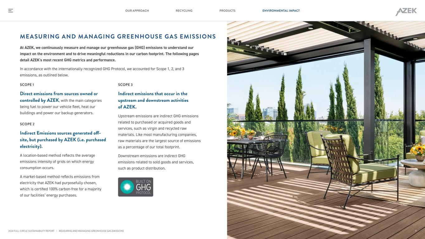 At AZEK, we continuously measure and manage our greenhouse gas (GHG) emissions to understand our impact on the environment and to drive meaningful reductions in our carbon footprint. The following pages detail AZEK's most recent GHG metrics and performance. In accordance with the internationally recognized GHG Protocol, we accounted for Scope 1, 2, and 3 emissions, as outlined below. SCOPE 1 Direct emissions from sources owned or controlled by AZEK, with the main categories being fuel to power our vehicle fleet, heat our buildings and power our backup generators. SCOPE 2 Indirect Emissions sources generated off- site, but purchased by AZEK (i.e. purchased electricity). A location-based method reflects the average emissions intensity of grids on which energy consumption occurs. A market-based method reflects emissions from electricity that AZEK had purposefully chosen, which is certified 100% carbon-free for a majority of our facilities’ energy purchases. SCOPE 3 Indirect emissions that occur in the upstream and downstream activities of AZEK. Upstream emissions are indirect GHG emissions related to purchased or acquired goods and services, such as virgin and recycled raw materials. Like most manufacturing companies, raw materials are the largest source of emissions as a percentage of our total footprint. Downstream emissions are indirect GHG emissions related to sold goods and services, such as product distribution. | MEASURING AND MANAGING GREENHOUSE GAS EMISSIONS ME ASURING AND M ANAGING GREENHOUSE GAS EMISSIONS 17 RECYCLING PRODUCTS ENVIRONMENTAL IMPACTOUR APPROACH 2024 FULL-CIRCLE SUSTAINABILITY REPORT
