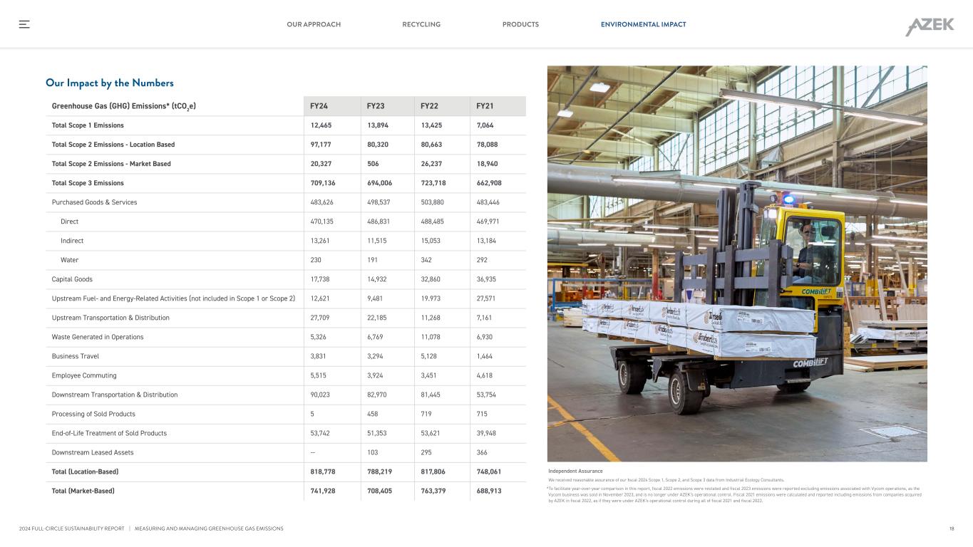 Greenhouse Gas (GHG) Emissions* (tCO2e) FY24 FY23 FY22 FY21 Total Scope 1 Emissions 12,465 13,894 13,425 7,064 Total Scope 2 Emissions - Location Based 97,177 80,320 80,663 78,088 Total Scope 2 Emissions - Market Based 20,327 506 26,237 18,940 Total Scope 3 Emissions 709,136 694,006 723,718 662,908 Purchased Goods & Services 483,626 498,537 503,880 483,446 Direct 470,135 486,831 488,485 469,971 Indirect 13,261 11,515 15,053 13,184 Water 230 191 342 292 Capital Goods 17,738 14,932 32,860 36,935 Upstream Fuel- and Energy-Related Activities (not included in Scope 1 or Scope 2) 12,621 9,481 19.973 27,571 Upstream Transportation & Distribution 27,709 22,185 11,268 7,161 Waste Generated in Operations 5,326 6,769 11,078 6,930 Business Travel 3,831 3,294 5,128 1,464 Employee Commuting 5,515 3,924 3,451 4,618 Downstream Transportation & Distribution 90,023 82,970 81,445 53,754 Processing of Sold Products 5 458 719 715 End-of-Life Treatment of Sold Products 53,742 51,353 53,621 39,948 Downstream Leased Assets -- 103 295 366 Total (Location-Based) 818,778 788,219 817,806 748,061 Total (Market-Based) 741,928 708,405 763,379 688,913 Our Impact by the Numbers Independent Assurance We received reasonable assurance of our fiscal 2024 Scope 1, Scope 2, and Scope 3 data from Industrial Ecology Consultants. *To facilitate year-over-year comparison in this report, fiscal 2022 emissions were restated and fiscal 2023 emissions were reported excluding emissions associated with Vycom operations, as the Vycom business was sold in November 2023, and is no longer under AZEK’s operational control. Fiscal 2021 emissions were calculated and reported including emissions from companies acquired by AZEK in fiscal 2022, as if they were under AZEK’s operational control during all of fiscal 2021 and fiscal 2022. | MEASURING AND MANAGING GREENHOUSE GAS EMISSIONS 18 RECYCLING PRODUCTS ENVIRONMENTAL IMPACTOUR APPROACH 2024 FULL-CIRCLE SUSTAINABILITY REPORT