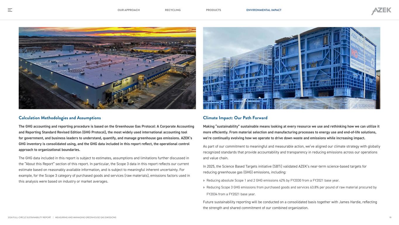 Calculation Methodologies and Assumptions The GHG accounting and reporting procedure is based on the Greenhouse Gas Protocol: A Corporate Accounting and Reporting Standard Revised Edition (GHG Protocol), the most widely used international accounting tool for government, and business leaders to understand, quantify, and manage greenhouse gas emissions. AZEK’s GHG inventory is consolidated using, and the GHG data included in this report reflect, the operational control approach to organizational boundaries. The GHG data included in this report is subject to estimates, assumptions and limitations further discussed in the “About this Report” section of this report. In particular, the Scope 3 data in this report reflects our current estimate based on reasonably available information, and is subject to meaningful inherent uncertainty. For example, for the Scope 3 category of purchased goods and services (raw materials), emissions factors used in this analysis were based on industry or market averages. Climate Impact: Our Path Forward Making “sustainability” sustainable means looking at every resource we use and rethinking how we can utilize it more efficiently. From material selection and manufacturing processes to energy use and end-of-life solutions, we’re continually evolving how we operate to drive down waste and emissions while increasing impact. As part of our commitment to meaningful and measurable action, we’ve aligned our climate strategy with globally recognized standards that provide accountability and transparency in reducing emissions across our operations and value chain. In 2025, the Science Based Targets initiative (SBTi) validated AZEK’s near-term science-based targets for reducing greenhouse gas (GHG) emissions, including: › Reducing absolute Scope 1 and 2 GHG emissions 42% by FY2030 from a FY2021 base year. › Reducing Scope 3 GHG emissions from purchased goods and services 63.8% per pound of raw material procured by FY2034 from a FY2021 base year. Future sustainability reporting will be conducted on a consolidated basis together with James Hardie, reflecting the strength and shared commitment of our combined organization. | MEASURING AND MANAGING GREENHOUSE GAS EMISSIONS 19 RECYCLING PRODUCTS ENVIRONMENTAL IMPACTOUR APPROACH 2024 FULL-CIRCLE SUSTAINABILITY REPORT