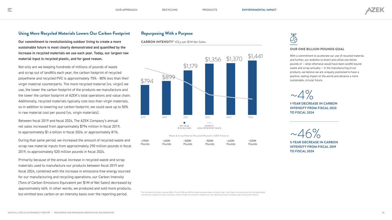 Using More Recycled Materials Lowers Our Carbon Footprint Our commitment to revolutionizing outdoor living to create a more sustainable future is most clearly demonstrated and quantified by the increase in recycled materials we use each year. Today, our largest raw material input is recycled plastic, and for good reason. Not only are we keeping hundreds of millions of pounds of waste and scrap out of landfills each year, the carbon footprint of recycled polyethene and recycled PVC is approximately 75% - 80% less than their virgin material counterparts. The more recycled material (vs. virgin) we use, the lower the carbon footprint of the products we manufacture and the lower the carbon footprint of AZEK’s total operations and value chain. Additionally, recycled materials typically cost less than virgin materials, so in addition to lowering our carbon footprint, we could save up to 50% in raw material cost per pound (vs. virgin materials). Between fiscal 2019 and fiscal 2024, The AZEK Company’s annual net sales increased from approximately $794 million in fiscal 2019, to approximately $1.4 billion in fiscal 2024, or approximately 81%. During that same period, we increased the amount of recycled waste and scrap raw material inputs from approximately 290 million pounds in fiscal 2019, to approximately 520 million pounds in fiscal 2024. Primarily because of the annual increase in recycled waste and scrap materials used to manufacture our products between fiscal 2019 and fiscal 2024, combined with the increase in emissions-free energy sourced for our manufacturing and recycling operations, our Carbon Intensity (Tons of Carbon Emissions Equivalent per $1M of Net Sales) decreased by approximately 46%. In other words, we produced and sold more products, but emitted less carbon on an intensity basis over the reporting period. CARBON INTENSITY* tC02e per $1M Net Sales Repurposing With a Purpose *The calculation of Carbon Intensity (Metric Tons of CO2e per $1M net sales) presented above includes Scope 1 and Scope 2 emissions, plus the Purchased Goods and Services category of Scope 3 emissions, which includes the emissions related to our raw material purchases including virgin and recycled material. OUR ONE BILLION POUNDS GOAL With a commitment to accelerate our use of recycled material, and further, our ambition to divert and utilize one billion pounds of — what otherwise would have been landfill-bound waste and scrap annually — in the manufacturing of our products, we believe we are uniquely positioned to have a positive, lasting impact on the world and advance a more sustainable, circular future. 2019 $1,441$1,370$1,356 $1,179 $899$794 NET SALES ($ IN MILLIONS) INTENSITY (tCO2e PER $1M NET SALES) 2020 2021 2022 2023 2024 ~4% 1-YEAR DECREASE IN CARBON INTENSITY FROM FISCAL 2023 TO FISCAL 2024 ~46% 5-YEAR DECREASE IN CARBON INTENSITY FROM FISCAL 2019 TO FISCAL 2024 ~290M Pounds ~400M Pounds ~500M Pounds ~500M Pounds ~420M Pounds ~520M Pounds Waste & Scrap Material Recycled/Reused in AZEK Products | MEASURING AND MANAGING GREENHOUSE GAS EMISSIONS 20 RECYCLING PRODUCTS ENVIRONMENTAL IMPACTOUR APPROACH 2024 FULL-CIRCLE SUSTAINABILITY REPORT