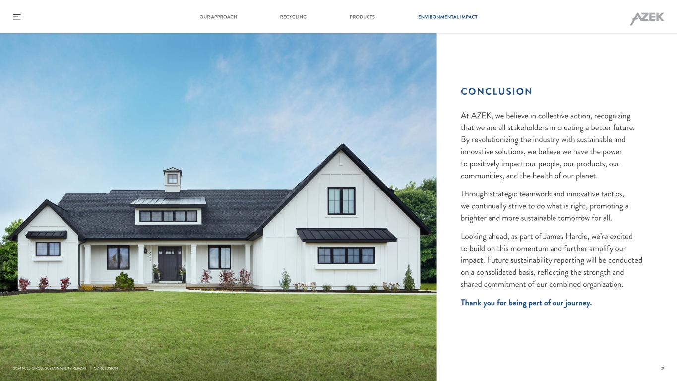 At AZEK, we believe in collective action, recognizing that we are all stakeholders in creating a better future. By revolutionizing the industry with sustainable and innovative solutions, we believe we have the power to positively impact our people, our products, our communities, and the health of our planet. Through strategic teamwork and innovative tactics, we continually strive to do what is right, promoting a brighter and more sustainable tomorrow for all. Looking ahead, as part of James Hardie, we’re excited to build on this momentum and further amplify our impact. Future sustainability reporting will be conducted on a consolidated basis, reflecting the strength and shared commitment of our combined organization. Thank you for being part of our journey. | CONCLUSION CONCLUSION 21 RECYCLING PRODUCTS ENVIRONMENTAL IMPACTOUR APPROACH 2024 FULL-CIRCLE SUSTAINABILITY REPORT