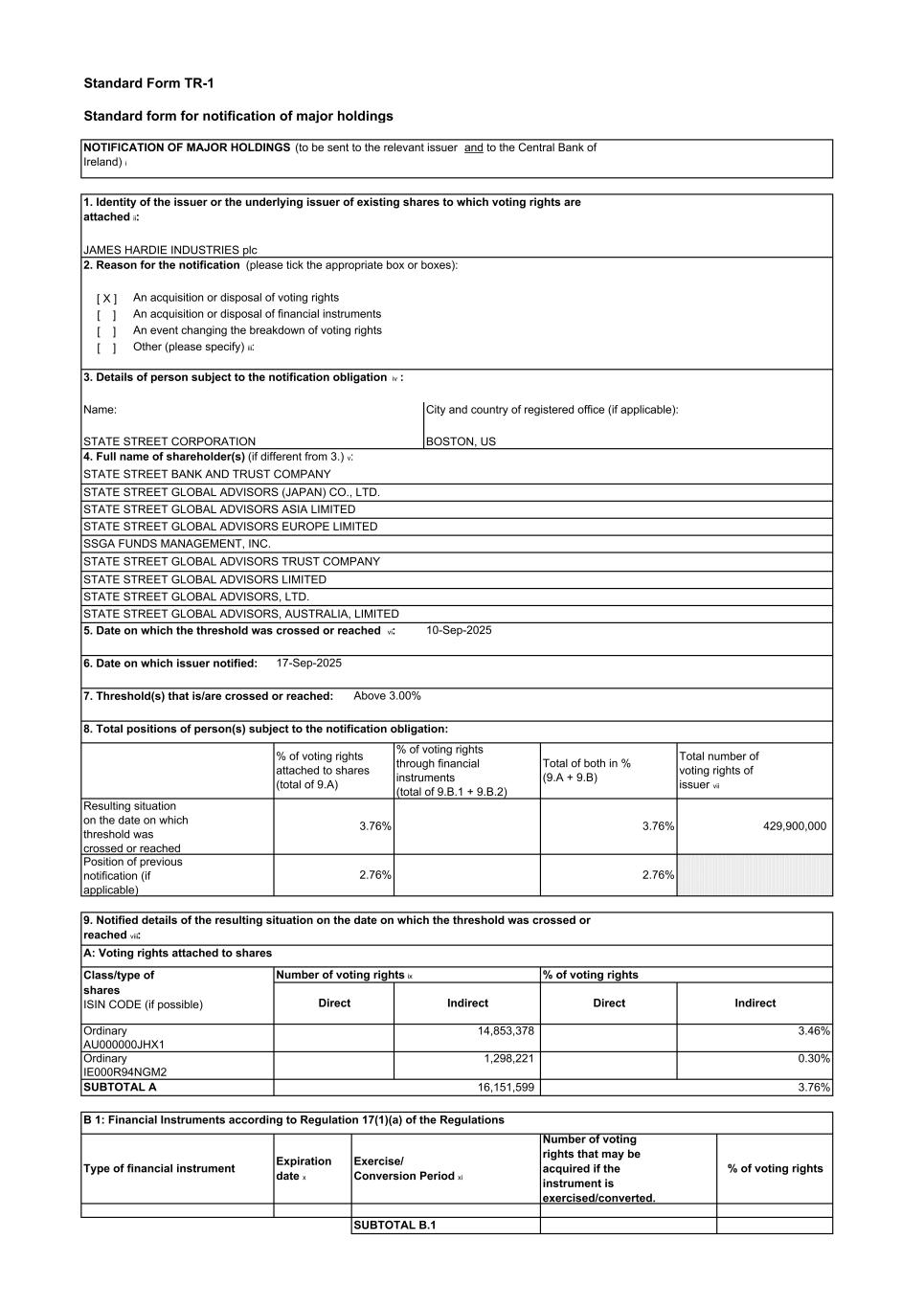 Standard Form TR-1 Standard form for notification of major holdings 2. Reason for the notification (please tick the appropriate box or boxes): [ X ] An acquisition or disposal of voting rights [ ] An acquisition or disposal of financial instruments [ ] An event changing the breakdown of voting rights [ ] Other (please specify) iii: 3. Details of person subject to the notification obligation iv : Name: City and country of registered office (if applicable): 4. Full name of shareholder(s) (if different from 3.) v: 8. Total positions of person(s) subject to the notification obligation: A: Voting rights attached to shares Class/type of B 1: Financial Instruments according to Regulation 17(1)(a) of the Regulations JAMES HARDIE INDUSTRIES plc % of voting rights attached to shares (total of 9.A) % of voting rights Expiration date x 2.76% 3.76% Direct 0.30% 7. Threshold(s) that is/are crossed or reached: Indirect Position of previous notification (if applicable) shares ISIN CODE (if possible) AU000000JHX1 IE000R94NGM2 NOTIFICATION OF MAJOR HOLDINGS (to be sent to the relevant issuer and to the Central Bank of Ireland) i Number of voting rights ix Number of voting rights that may be acquired if the instrument is exercised/converted. % of voting rights 16,151,599 STATE STREET GLOBAL ADVISORS TRUST COMPANY STATE STREET GLOBAL ADVISORS, LTD. 429,900,000 STATE STREET GLOBAL ADVISORS EUROPE LIMITED STATE STREET GLOBAL ADVISORS (JAPAN) CO., LTD. 1. Identity of the issuer or the underlying issuer of existing shares to which voting rights are attached ii: 2.76% Total of both in % (9.A + 9.B) Direct SUBTOTAL B.1 3.76% Exercise/ Conversion Period xi 5. Date on which the threshold was crossed or reached vi: 3.46% % of voting rights through financial instruments (total of 9.B.1 + 9.B.2) 10-Sep-2025 1,298,221 Ordinary Ordinary SUBTOTAL A STATE STREET CORPORATION Total number of voting rights of issuer vii STATE STREET BANK AND TRUST COMPANY STATE STREET GLOBAL ADVISORS ASIA LIMITED STATE STREET GLOBAL ADVISORS, AUSTRALIA, LIMITED Type of financial instrument Indirect 9. Notified details of the resulting situation on the date on which the threshold was crossed or reached viii: 6. Date on which issuer notified: 14,853,378 Resulting situation on the date on which threshold was crossed or reached BOSTON, US 17-Sep-2025 Above 3.00% 3.76% SSGA FUNDS MANAGEMENT, INC. STATE STREET GLOBAL ADVISORS LIMITED
