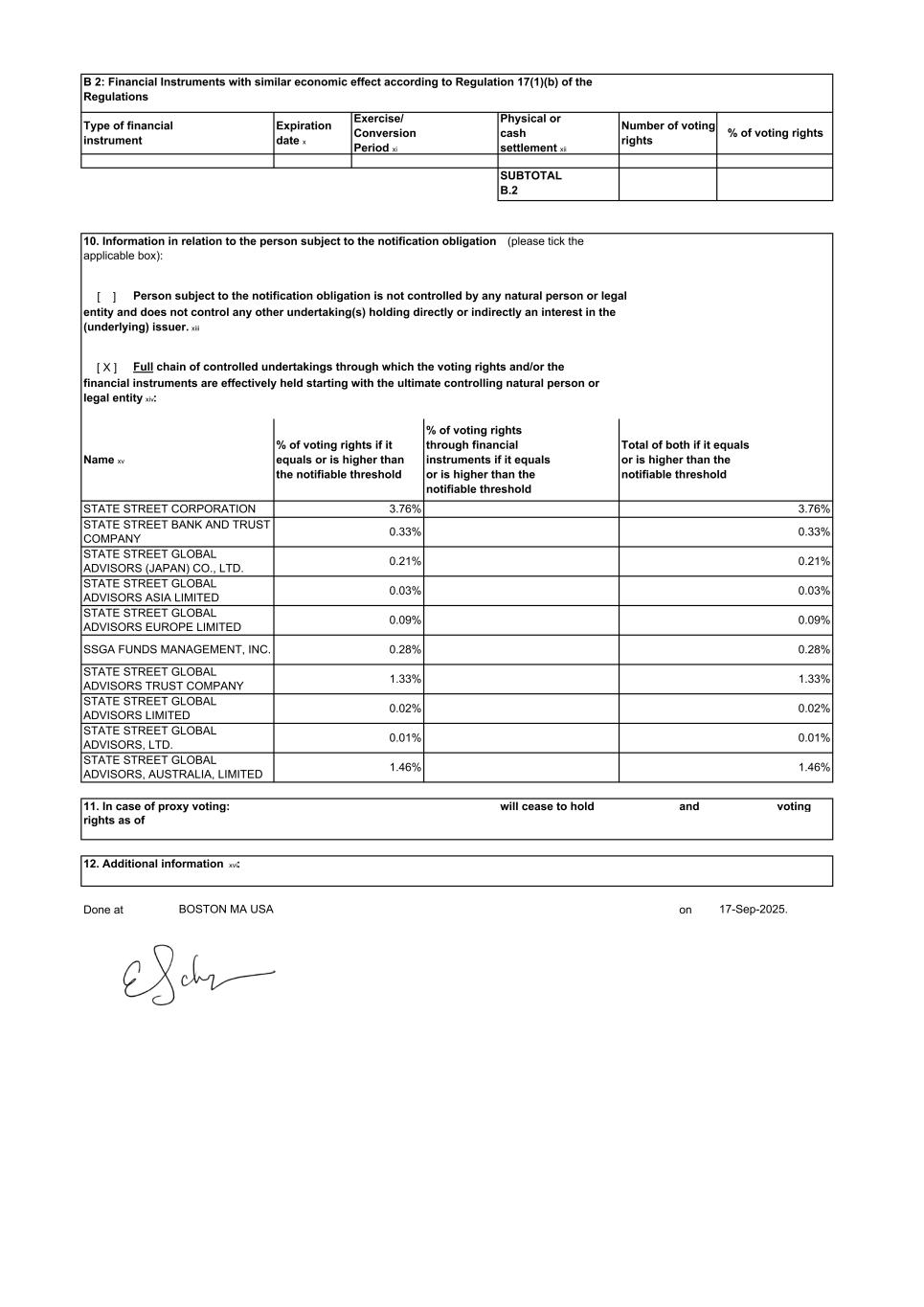 [ ] Person subject to the notification obligation is not controlled by any natural person or legal [ X ] Full chain of controlled undertakings through which the voting rights and/or the and voting 12. Additional information xvi: Done at on BOSTON MA USA Exercise/ Conversion Period xi STATE STREET GLOBAL ADVISORS TRUST COMPANY STATE STREET GLOBAL ADVISORS EUROPE LIMITED % of voting rights 17-Sep-2025. 0.01% 0.01% 0.21% 3.76% 1.33% 0.09% 0.21% 3.76% 1.33% STATE STREET GLOBAL ADVISORS LIMITED 11. In case of proxy voting: STATE STREET GLOBAL ADVISORS, AUSTRALIA, LIMITED STATE STREET BANK AND TRUST COMPANY Name xv Type of financial instrument entity and does not control any other undertaking(s) holding directly or indirectly an interest in the (underlying) issuer. xiii Expiration date x Total of both if it equals or is higher than the notifiable threshold SSGA FUNDS MANAGEMENT, INC. Number of voting rights STATE STREET GLOBAL ADVISORS ASIA LIMITED 1.46% 0.03% 0.33% 0.02% 0.28% % of voting rights through financial instruments if it equals or is higher than the notifiable threshold 0.03% 0.33% % of voting rights if it equals or is higher than the notifiable threshold 0.02% 0.28% 0.09% rights as of 10. Information in relation to the person subject to the notification obligation (please tick the applicable box): SUBTOTAL B.2 B 2: Financial Instruments with similar economic effect according to Regulation 17(1)(b) of the Regulations Physical or cash settlement xii STATE STREET GLOBAL ADVISORS (JAPAN) CO., LTD. will cease to hold STATE STREET CORPORATION financial instruments are effectively held starting with the ultimate controlling natural person or legal entity xiv: 1.46% STATE STREET GLOBAL ADVISORS, LTD.